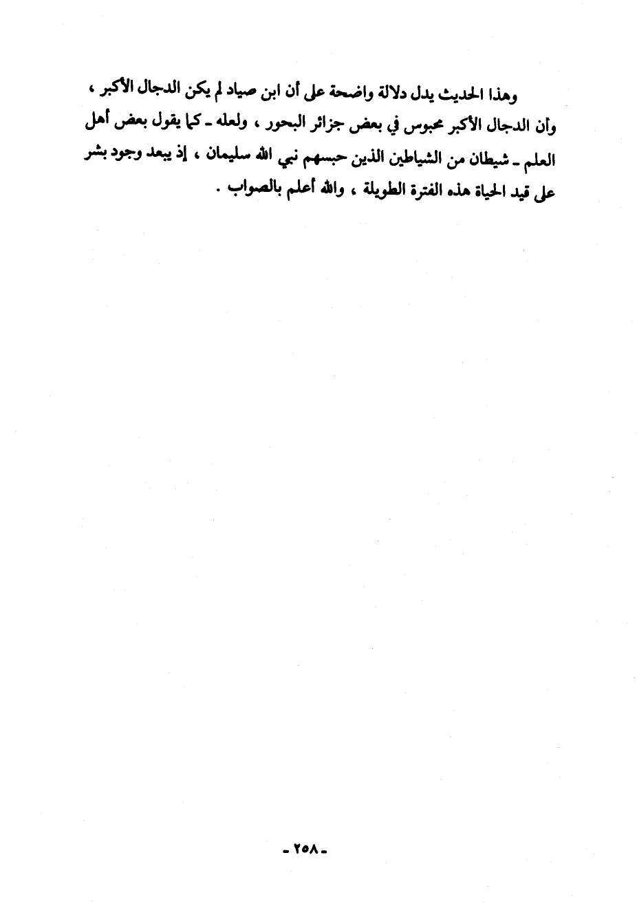 وهذا الحديث يدل دلالة واضحة على أن ابن صياد لم يكن الدجال الأكبر، وأن الدجال الأكبر محبوس في بعض جزائر البحور، ولعله - كما يقول بعض أهل العلم - شيطان من الشياطين الذين حبسهم نبي الله سليمان، إذ يبعد وجود بشر على قيد الحياة هذه الفترة الطويلة، والله أعلم بالصواب.