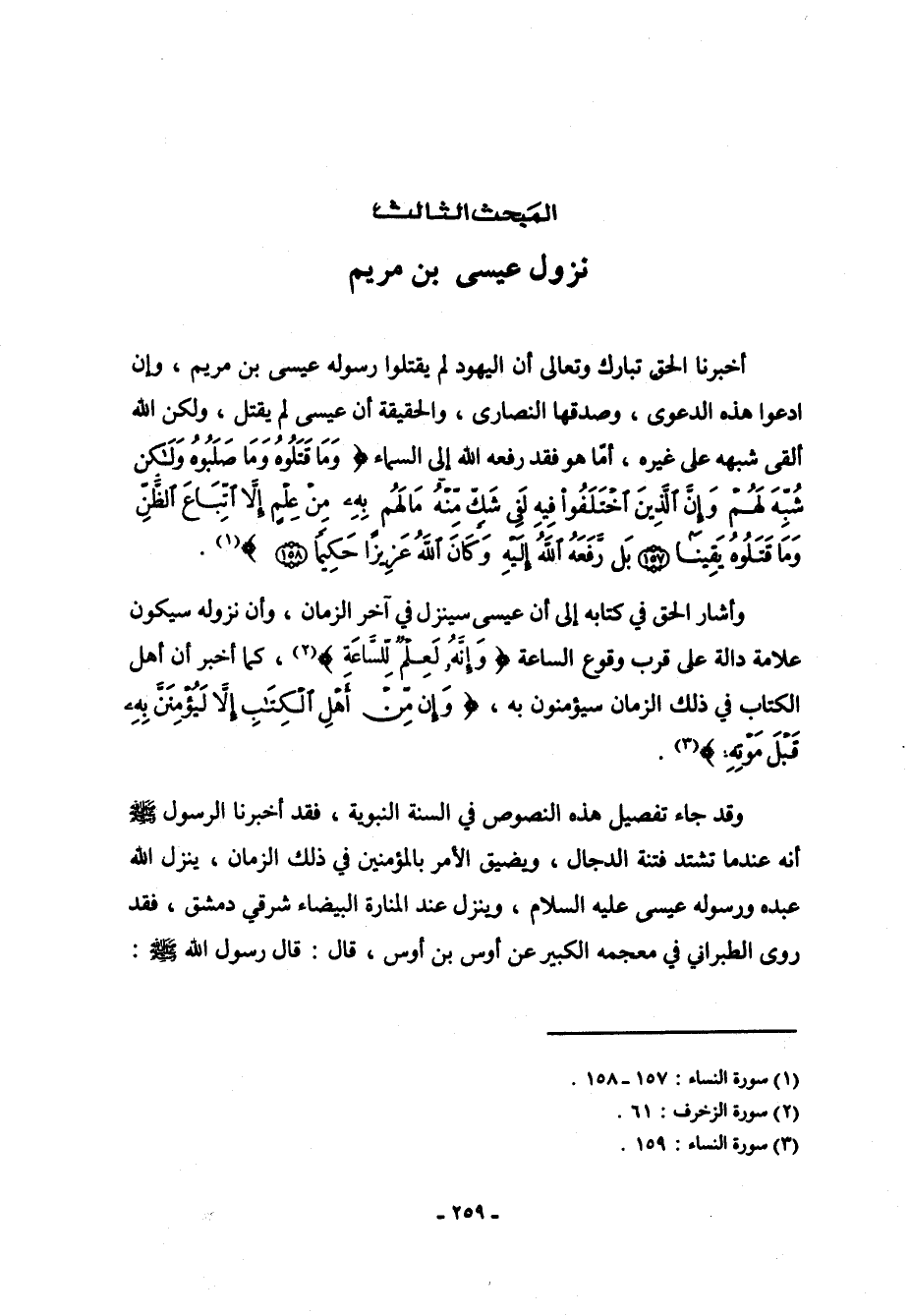 أخبرنا الحق تبارك وتعالى أن اليهود لم يقتلوا رسوله عيسى ابن مريم، وإن ادعوا هذه الدعوى، وصدقها النصارى، والحقيقة أن عيسى لم يقتل، ولكن الله ألقى شبهه على غيره، أما هو فقد رفعه الله إلى السماء (وَمَا قَتَلُوهُ وَمَا صَلَبُوهُ وَلَكِن شُبِّهَ لَهُمْ وَإِنَّ الَّذِينَ اخْتَلَفُواْ فِيهِ لَفِي شَكٍّ مِّنْهُ مَا لَهُم بِهِ مِنْ عِلْمٍ إِلاَّ اتِّبَاعَ الظَّنِّ وَمَا قَتَلُوهُ يَقِينًا- بَل رَّفَعَهُ اللهُ إِلَيْهِ وَكَانَ اللهُ عَزِيزًا حَكِيمًا) [النساء: 157-158] .