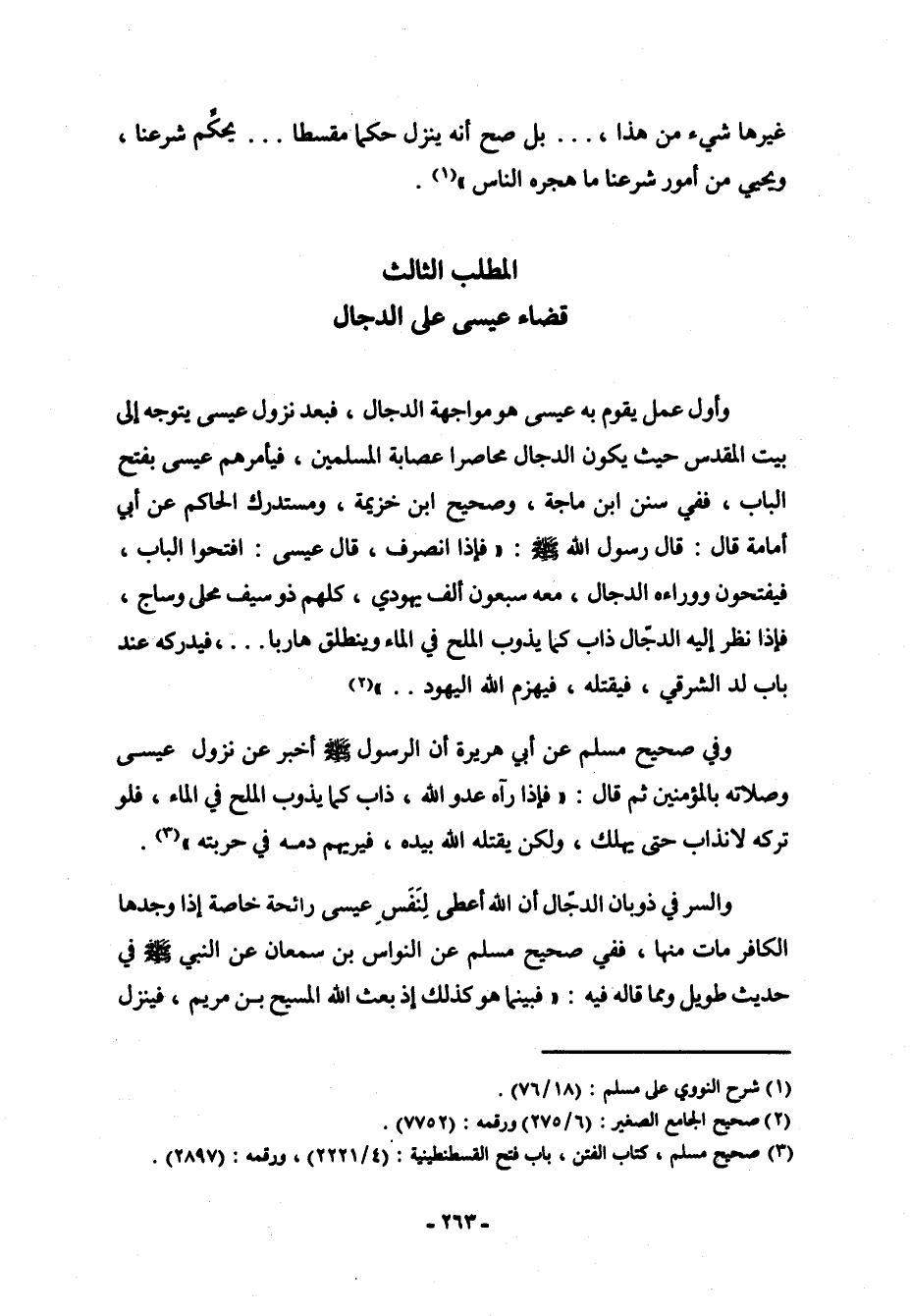 وفي صحيح مسلم عن أبي هريرة أن الرسول صلى الله عليه وسلم أخبر عن نزول عيسى وصلاته بالمؤمنين ثم قال: " فإذا رآه عدو الله، ذاب كما يذوب الملح في الماء، فلو تركه لانذاب حتى يهلك، ولكن يقتله الله بيده، فيريهم دمه ي حربته " (¬3) .