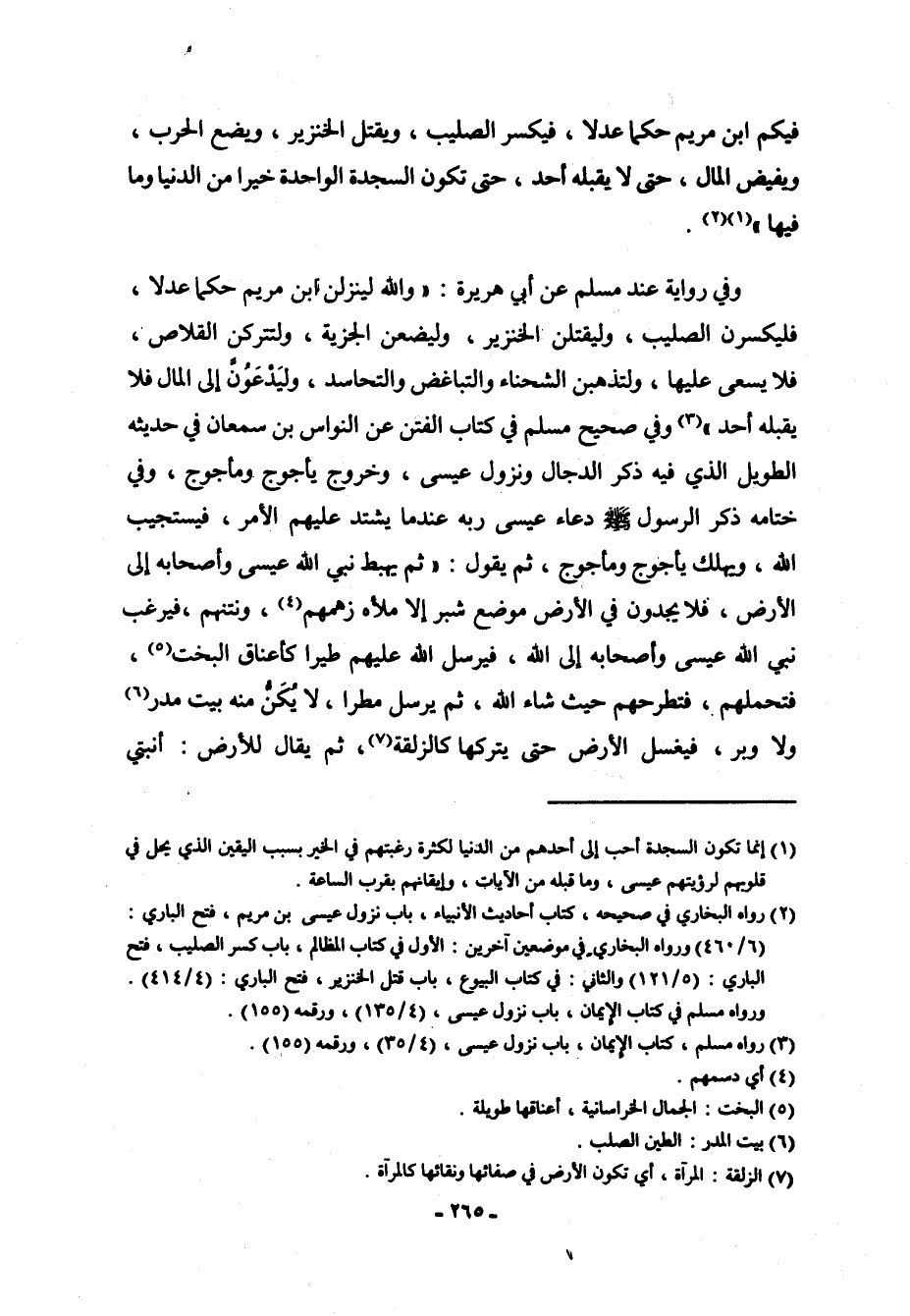 (¬2) رواه البخاري في صحيح، كتاب أحاديث الأنبياء، باب نزول عيسى ابن مريم، فتح الباري: (6/460) ورواه البخاري في موضعين آخرين: الأول في كتاب المظالم، باب كسر الصليب، فتح الباري: (05/121) والثاني: في كتاب البيوع، باب قتل الخنزير، فتح الباري: (4/414) . ورواه مسلم في كتاب الإيمان، باب نزول عيسى، (4/135) ، ورقمه (155) .
