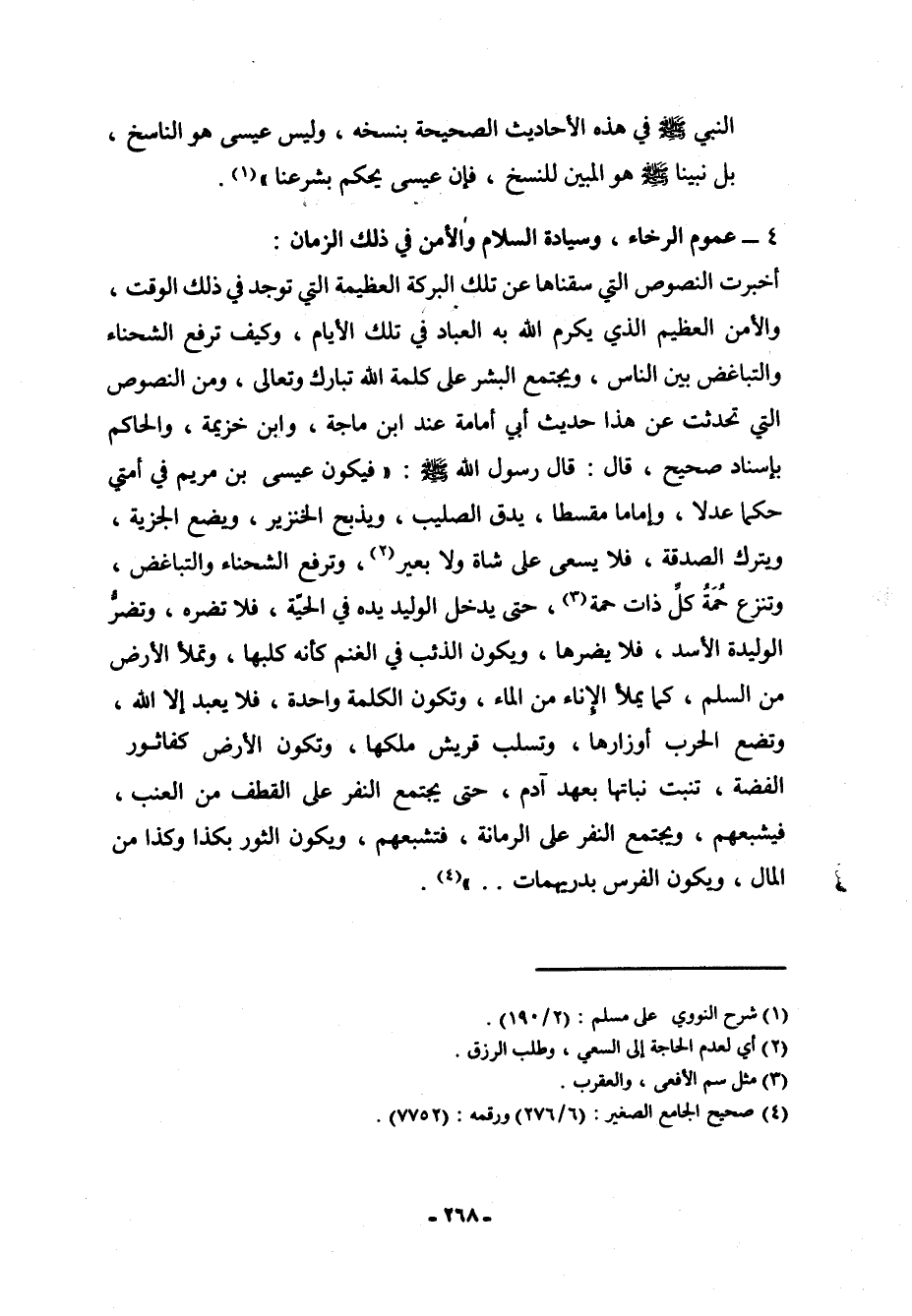 ومن النصوص التي تحدثت عن هذا حديث أبي أمامة عند ابن ماجة، وابن خزيمة، والحاكم بإسناد صحيح، قال: قال رسول الله صلى الله عليه وسلم: " فيكون عيسى ابن مريم في أمتي حكماً عدلاً، وإماماً مقسطاً، يدق الصليب، ويذبح الخنزير، ويضع الجزية، ويترك الصدقة، فلا يسعى على شاة ولا بعير (¬2) ، وترفع الشحناء والتباغض، وتنزع حُمَةُ كل ذات حمة (¬3) ، حتى يدخل الوليد يده في الحية، فلا تضره، وتضرُّ الوليدة الأسد، فلا يضرها، ويكون الذئب في الغنم كأنه كلبها، وتملأ الأرض من السلم، كما يملأ الإناء من الماء، وتكون الكلمة الواحدة، فلا يعبد إلا الله، وتضع الحرب أوزارها، وتسلب قريش ملكها، وتكون الأرض كفاثور الفضة، تنبت نباتها بعهد آدم، حتى يجتمع النفر على القطف من العنب، فيشبعهم، ويجتمع النفر على الرمانة، فتشبعهم، ويكون الثور بكذا وكذا من المال، ويكون الفرس بدريهمات.. " (¬4) .