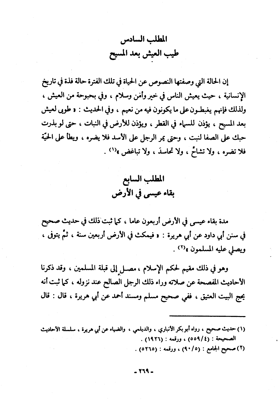إن الحالة التي وصفتها النصوص عن الحياة في تلك الفترة حالة فذة في تاريخ الإنسانية، حيث يعيش الناس في خير وأمن وسلام، وفي بحبوحة من العيش، ولذلك فإنهم يغبطون على ما يكونون فيه من نعيم، وفي الحديث: " طوبى لعيش بعد المسيح، يؤذن للسماء في القطر، ويؤذن للأرض في النبات، حتى لو بذرت حبك على الصفا لنبت، وحتى يمر الرجل على الأسد فلا يضره، ويطأ على الحية فلا تضره، ولا تشاحّ، ولا تحاسد، ولا تباغض " (¬1) .
