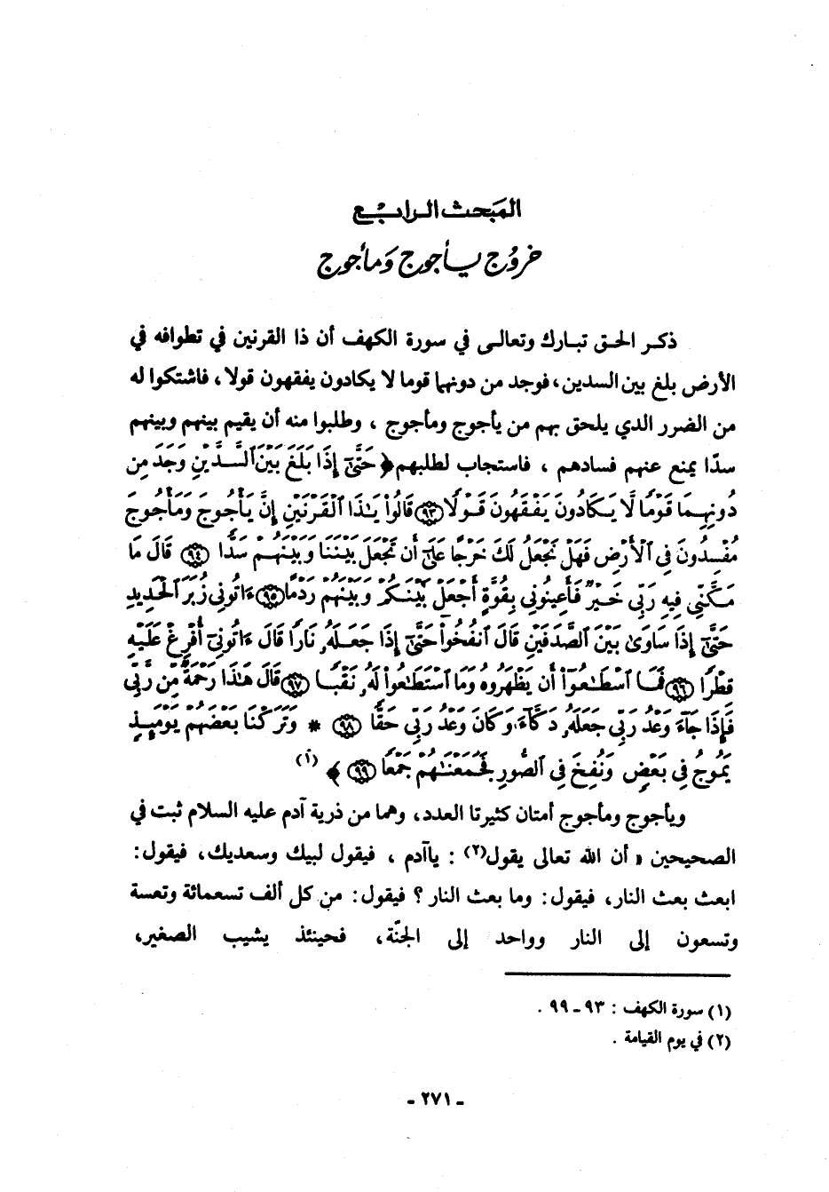 ذكر الحق تبارك وتعالى في سورة الكهف أن ذا القرنين في تطوافه في الأرض بلغ بين السدين، فوجد من دونهما قوماً لا يكادون يفقهون قولاً، فاشتكوا له من الضرر الذي يلحق بهم من يأجوج ومأجوج، وطلبوا منه أن يقيم بينهم وبينه سداً يمنع عنهم فسادهم، فاستجاب لطلبهم (حَتَّى إِذَا بَلَغَ بَيْنَ السَّدَّيْنِ وَجَدَ مِن دُونِهِمَا قَوْمًا لَّا يَكَادُونَ يَفْقَهُونَ قَوْلًا - قَالُوا يَا ذَا الْقَرْنَيْنِ إِنَّ يَأْجُوجَ وَمَأْجُوجَ مُفْسِدُونَ فِي الْأَرْضِ فَهَلْ نَجْعَلُ لَكَ خَرْجًا عَلَى أَن تَجْعَلَ بَيْنَنَا وَبَيْنَهُمْ سَدًّا - قَالَ مَا مَكَّنِّي فِيهِ رَبِّي خَيْرٌ فَأَعِينُونِي بِقُوَّةٍ أَجْعَلْ بَيْنَكُمْ وَبَيْنَهُمْ رَدْمًا - آتُونِي زُبَرَ الْحَدِيدِ حَتَّى إِذَا سَاوَى بَيْنَ الصَّدَفَيْنِ قَالَ انفُخُوا حَتَّى إِذَا جَعَلَهُ نَارًا قَالَ آتُونِي أُفْرِغْ عَلَيْهِ قِطْرًا - فَمَا اسْطَاعُوا أَن يَظْهَرُوهُ وَمَا اسْتَطَاعُوا لَهُ نَقْبًا - قَالَ هَذَا رَحْمَةٌ مِّن رَّبِّي فَإِذَا جَاء وَعْدُ رَبِّي جَعَلَهُ دَكَّاء وَكَانَ وَعْدُ رَبِّي حَقًّا - وَتَرَكْنَا بَعْضَهُمْ يَوْمَئِذٍ يَمُوجُ فِي بَعْضٍ وَنُفِخَ فِي الصُّورِ فَجَمَعْنَاهُمْ جَمْعًا) [الكهف: 93-99] .