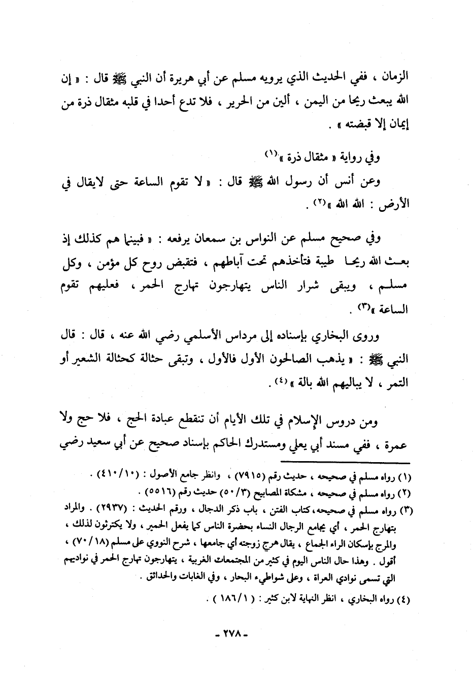 الزمان، ففي الحديث الذي يرويه مسلم عن أبي هريرة أن النبي صلى الله عليه وسلم قال: " إن الله يبعث ريحاً من اليمن، ألين من الحرير، فلا تدع أحداً في قلبه مثقال ذرة من إيمان إلا قبضته ".