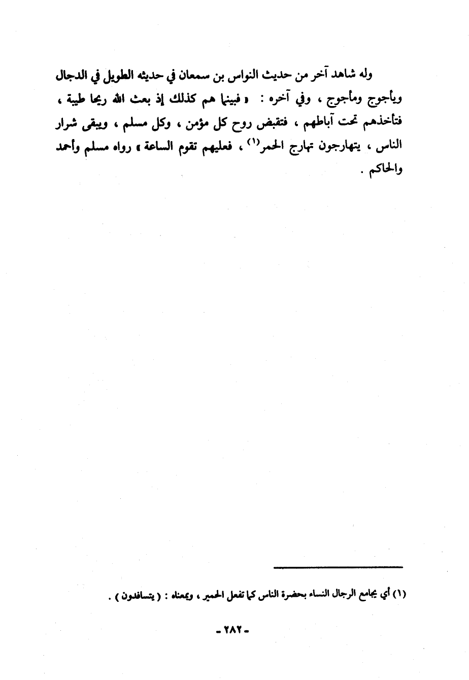 وله شاهد آخر من حديث النواس بن سمعان في حديثه الطويل في الدجال ويأجوج ومأجوج، وفي آخره: " فبينما هم كذلك إذ بعث الله ريحاً طيبة، فتأخذهم تحت آباطهم، فتقبض روح كل مؤمن، وكل مسلم، ويبقى شرار الناس، يتهارجون تهارج الحمر (¬1) ، فعليهم تقوم الساعة " رواه مسلم وأحمد والحاكم.
