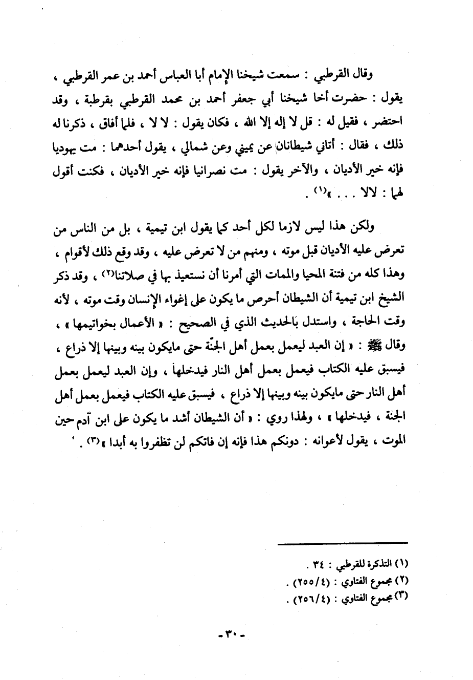 وقال القرطبي: سمعت شيخنا الإمام أبا العباس أحمد بن عمر القرطبي، يقول: حضرت أخا شيخنا أبي جعفر أحمد بن محمد القرطبي بقرطبة، وقد احتضر، فقيل له: لا إله إلا الله، فكان يقول: لا، لا، فلما أفاق، ذكرنا له ذلك، فقال: أتاني شيطانان عن يميني وعن شمالي، يقول أحدهما: مت يهودياً فإنه خير الأديان، والآخر يقول: مت نصرانياً فإنه خير الأديان، فكنت أقول لهما: لا، لا.. " (¬1) .