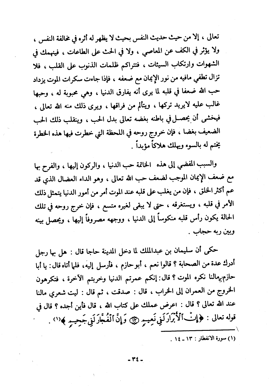حُكي أن سليمان بن عبد الملك لما دخل المدينة حاجاً قال: هل بها رجل أدرك عدة من الصحابة؟ قالوا: نعم، أبو حازم، فأرسل إليه، فلما أتاه قال: يا أبا حازم ما لنا نكره الموت؟ قال: إنكم عمرتم الدنيا وخربتم الآخرة، فتكرهون الخروج من العمران إلى الخراب، قال: صدقت، ثم قال: ليت شعري ما لنا عند الله تعالى؟ قال: اعرض عملك على كتاب الله، قال فأين أجده؟ قال في قوله تعالى: (إِنَّ الْأَبْرَارَ لَفِي نَعِيمٍ - وَإِنَّ الْفُجَّارَ لَفِي جَحِيمٍ) [الإنفطار: 13-14] .