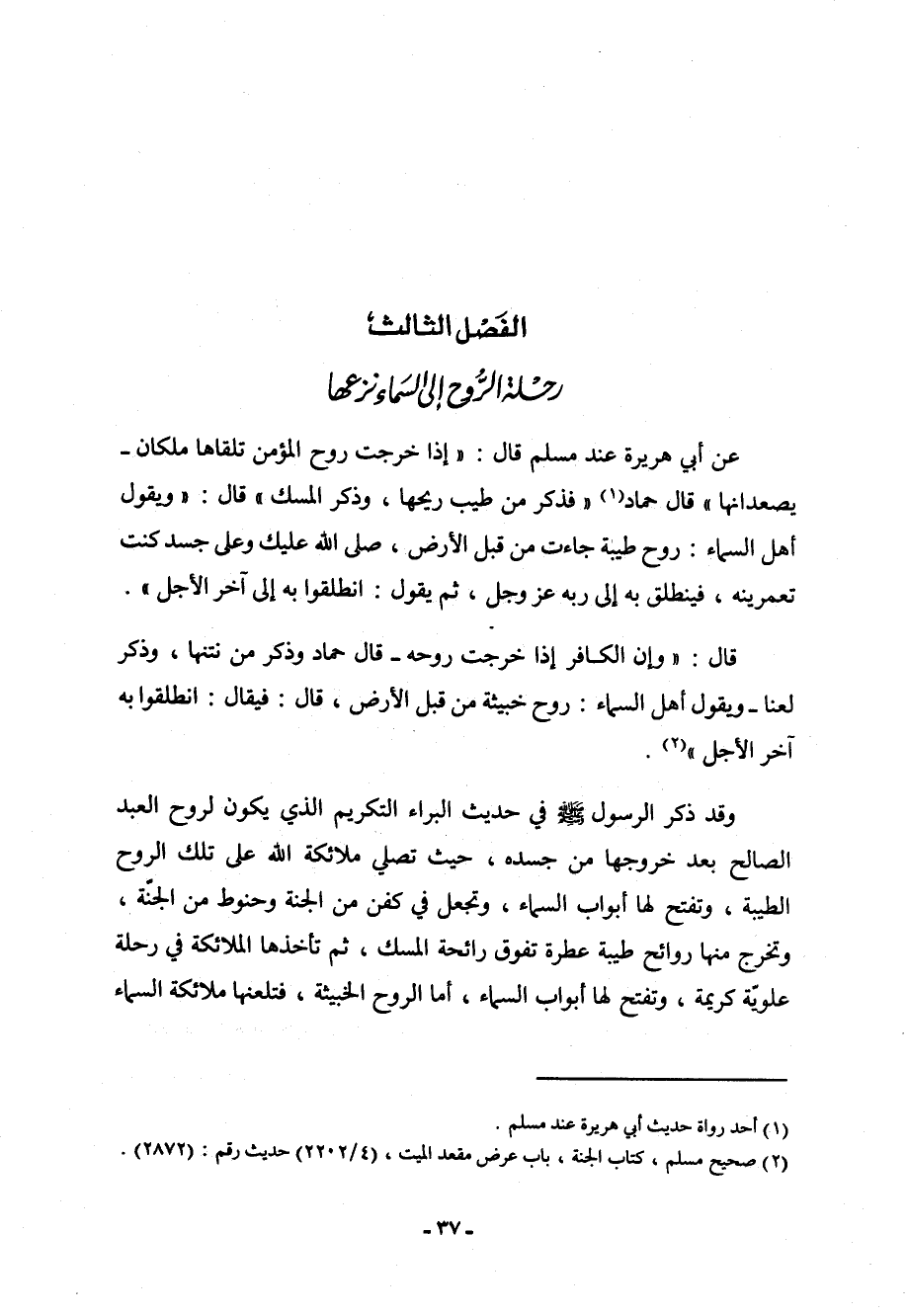 عن أبي هريرة عند مسلم قال: " إذا خرجت روح المؤمن تلقاها ملكان - يُصعدانها ". قال حماد (¬1) : فذكر من طيب ريحها، وذكر المسك قال: " ويقول أهل السماء: روح طيبة جاءت من قبل الأرض، صلى الله عليك وعلى جسد كنت تعمرينه، فينطلق به إلى ربه عز وجل، ثم يقول: انطلقوا به إلى آخر الأجل ".