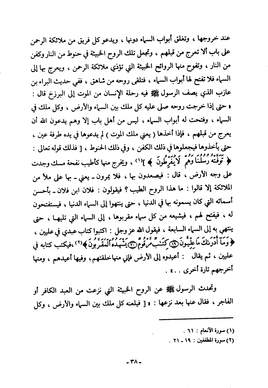 قال: فيصعدون بها، فلا يمرون - يعني - بها على ملأ من الملائكة إلا قالوا: ما هذا الروح الطيب؟ فيقولون: فلان ابن فلان - بأحسن أسمائه التي كان يسمونه بها في الدنيا، حتى ينتهوا إلى السماء الدنيا، فيستفتحون له، فيفتح لهم، فيشيعه من كل سماء مقربوها، إلى السماء التي تليها، حتى ينتهى به إلى السماء السابعة، فيقول الله عز وجل: اكتبوا كتاب عبدي في عليين، (وَمَا أَدْرَاكَ مَا عِلِّيُّونَ - كِتَابٌ مَّرْقُومٌ - يَشْهَدُهُ الْمُقَرَّبُونَ) [المطففين: 19-21] ، فيكتب كتابه في عليين، ثم يقال: أعيدوه إلى الأرض فإني منها خلقتهم، وفيها أعيدهم، ومنها أخرجهم تارة أخرى.. ".