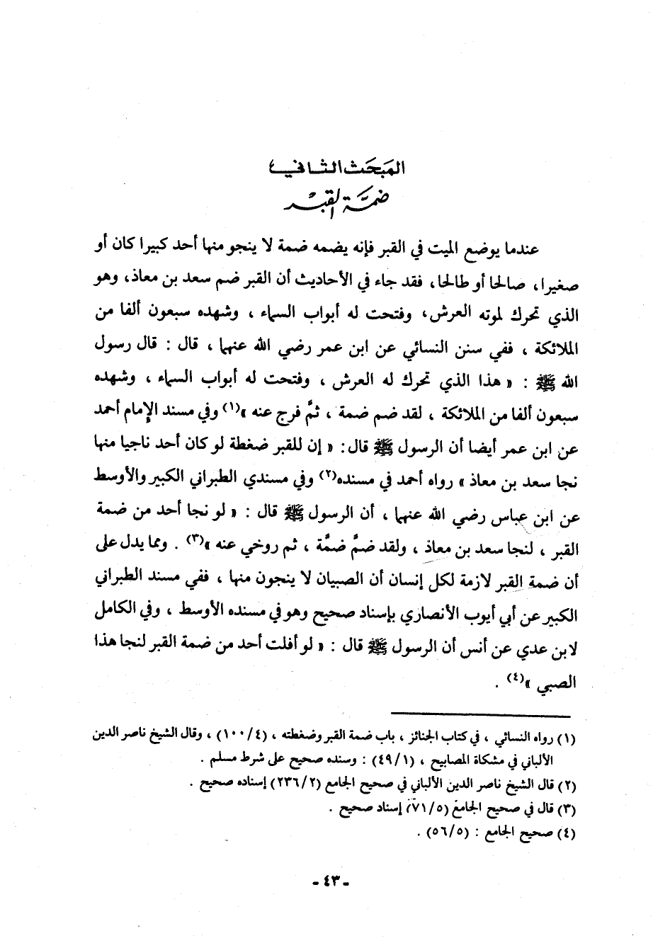 (¬1) رواه النسائي: في كتاب الجنائز، باب ضمة القبر وضغطته، (4/100) ، وقال الشيخ ناصر الدين الألباني في مشكاة المصابيح، (1/49) : وسنده صحيح على شرط مسلم.