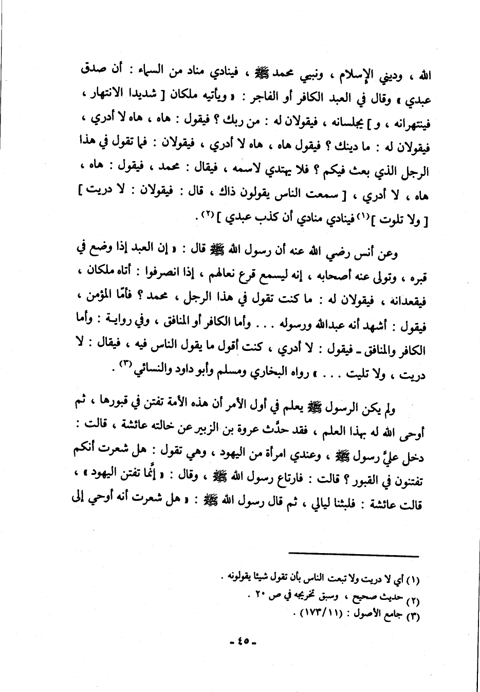 وعن أنس رضي الله عنه أن رسول الله صلى الله عليه وسلم قال: " إن العبد إذا وضع في قبره، وتولى عنه أصحابه، إنه ليسمع قرع نعالهم، إذا انصرفوا: أتاه ملكان، فيقعدانه، فيقولان له: ما كنت تقول في هذا الرجل، محمد؟ فأما المؤمن، فيقول: أشهد أنه عبد الله ورسوله..، وأما الكافر أو المنافق، وفي رواية: وأما الكافر والمنافق - فيقول: لا أدري، كنت أقول ما يقول الناس فيه، فيقال: لا دريت، ولا تليت.." رواه البخاري ومسلم وأبو داو والنسائي (¬3) .