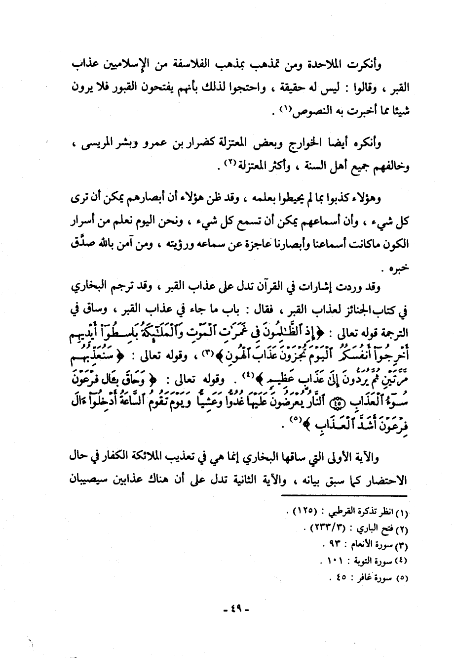 وأنكرت الملاحدة ومن تمذهب بمذهب الفلاسفة من الإسلاميين عذاب القبر، وقالوا: ليس له حقيقة، واحتجوا لذلك بأنهم يفتحون القبور فلا يرون شيئاً مما أخبرت به النصوص (¬1) .