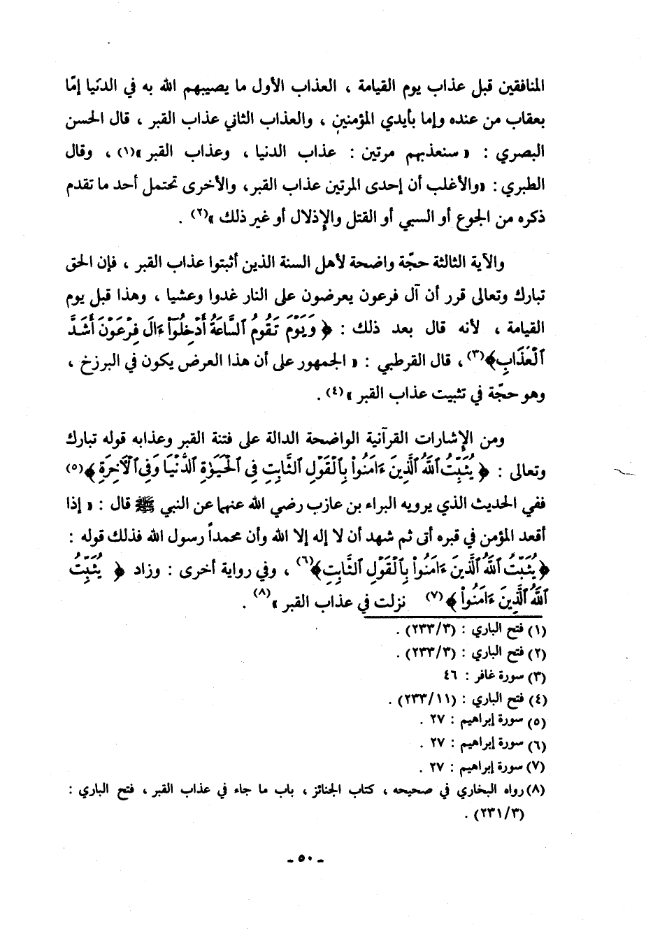 ومن الإشارات القرآنية الواضحة الدالة على فتنة القبر وعذابه قوله تبارك وتعالى: (يُثَبِّتُ اللهُ الَّذِينَ آمَنُواْ بِالْقَوْلِ الثَّابِتِ فِي الْحَيَاةِ الدُّنْيَا وَفِي الآخِرَةِ) [إبراهيم: 27] ففي الحديث الذي يرويه البراء بن عازب رضي الله عنهما عن النبي صلى الله عليه وسلم قال: " إذا أقعد المؤمن في قبره أتى ثم شهد أن لا إله إلا الله وأن محمداً رسول الله فذلك قوله: (يُثَبِّتُ اللهُ الَّذِينَ آمَنُواْ بِالْقَوْلِ الثَّابِتِ) [إبراهيم: 27] ، وفي رواية أخرى: وزاد: (يُثَبِّتُ اللهُ الَّذِينَ آمَنُواْ) [إبراهيم: 27] نزلت في عذاب القبر " (¬4) .