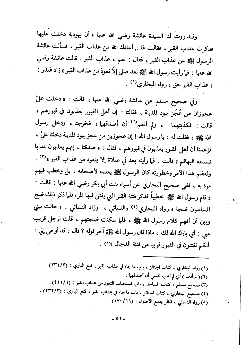 وقد روت لنا السيدة عائشة رضي الله عنها: " أن اليهودية دخلت عليها فذكرت عذاب القبر، فقالت لها: أعاذك الله من عذاب القبر، فسألت عائشة الرسول صلى الله عليه وسلم عن عذاب القبر، فقال: نعم، عذاب القبر. قالت عائشة رضي الله عنها: فما رأيت رسول الله صلى الله عليه وسلم بعد صلى إلا تعوذ من عذاب القبر " زاد غندر: " عذاب القبر حق " رواه البخاري (¬1) .