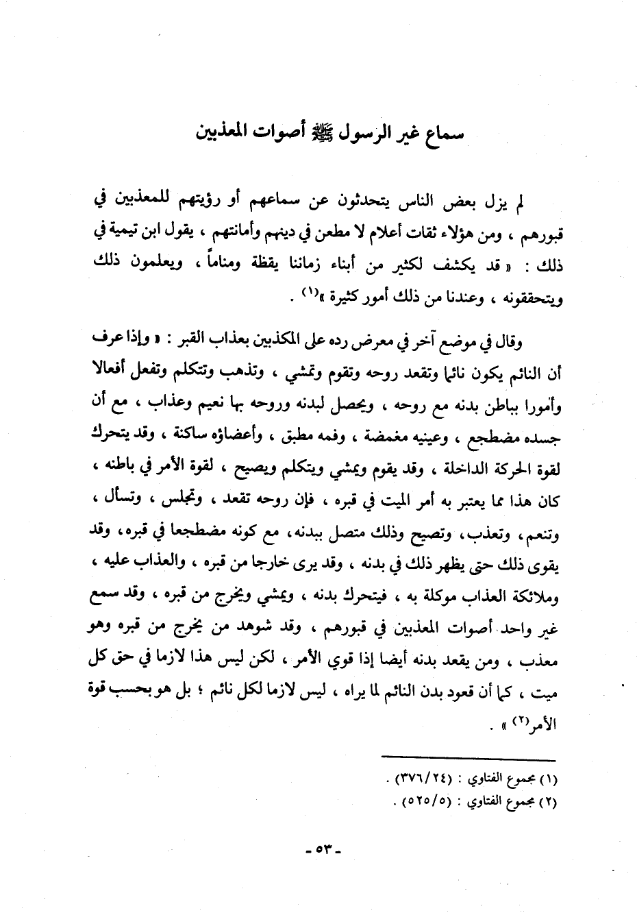 وقال في موضع آخر في معرض رده على المكذبين بعذاب القبر " وإذا عرف أن النائم يكون نائماً وتقعد روحه وتقوم وتمشي، وتذهب وتتكلم وتفعل أفعالاً وأموراً بباطن بدنه مع روحه، ويحصل لبدنه وروحه بها نعيم وعذاب، مع أن جسده مضطجع، وعينيه مغمضة، وفمه مطبق، وأعضاؤه ساكنة، وقد يتحرك لقوة الحركة الداخلة، وقد يقوم ويمشي ويتكلم ويصيح، لقوة الأمر في باطنه، كان هذا مما يعتبر به أمر الميت في قبره، فإن روحه تقعد، وتجلس، وتسأل، وتنعم، وتعذب، وتصيح وذلك متصل ببدنه، مع كونه مضطجعاً في قبره، وقد يقوى ذلك حتى يظهر ذلك في بدنه، وقد يرى خارجاً من قبره، والعذاب عليه، وملائكة العذاب موكلة به، فيتحرك بدنه، ويمشي ويخرج من قبره، وقد سمع غير واحد أصوات المعذبين في قبورهم، وقد شوهد من يخرج من قبره وهو معذب، ومن يقعد بدنه أيضاً إذا قوي الأمر، لكن ليس هذا لازماً في حق كل ميت، كما أن قعود بدن النائم لما يراه، ليس لازماً لكل نائم، بل هو بحسب قوة الأمر " (¬2) .