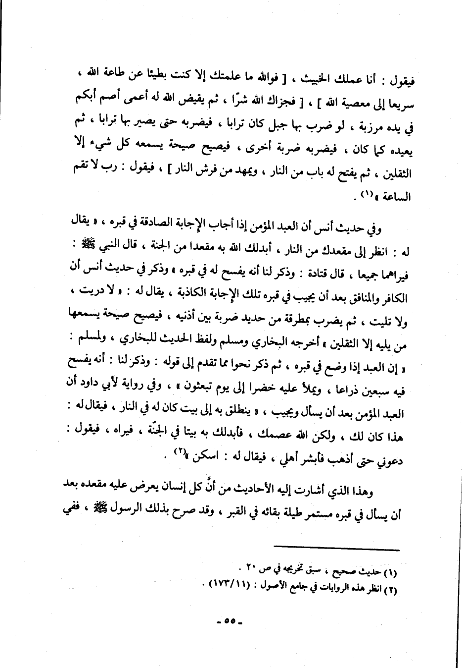 وفي حديث أنس أن العبد المؤمن إذا أجاب الإجابة الصادقة في قبره، " يقال له: انظر إلى مقعدك من النار، أبدلك الله به مقعداً من الجنة، قال النبي صلى الله عليه وسلم: فيراهما جميعاً، قال قتادة: وذكر لنا أنه يفسح له في قبره " وذكر في حديث أنس أن الكافر والمنافق بعد أن يجيب في قبره تلك الإجابة الكاذبة، يقال له: " لا دريت، ولا تليت، ثم يضرب بمطرقة من حديد ضربة بين أذنيه، فيصيح صيحة يسمعها من يليه إلا الثقلين " أخرجه البخاري ومسلم، ولفظ الحديث للبخاري، ولمسلم: " إن العبد إذا وضع في قبره، ثم ذكر نحواً مما تقدم إلى قوله: وذكر لنا: أنه يفسح فيه سبعين ذراعاً، ويملأ عليه خضراً إلى يوم تبعثون "، وفي رواية لأبي داود أن العبد المؤمن بعد أن يسأل ويجيب: " ينطلق به إلى بيت كان له في النار، فيقول له: هذا كان لك، ولكن الله عصمك، فأبدلك به بيتاً في الجنة، فيراه، فيقول: دعوني حتى أذهب فأبشر أهلي، فيقال له: اسكن " (¬2) .
