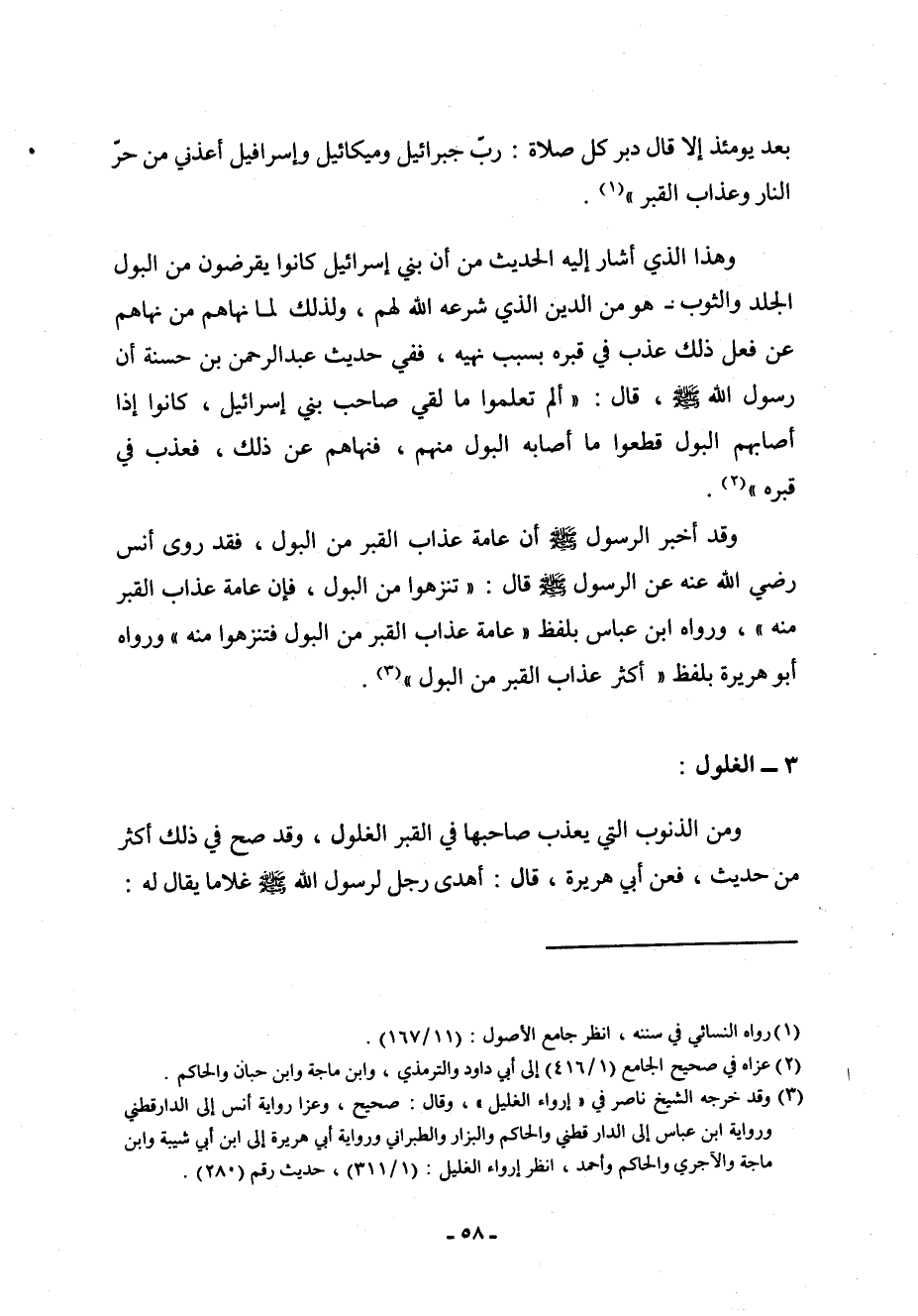 وقد أخبر الرسول صلى الله عليه وسلم أن عامة عذاب القبر من البول، فقد روى أنس رضي الله عنه، عن الرسول صلى الله عليه وسلم قال: " تنزهوا من البول، فإن عامة عذاب القبر منه "، ورواه ابن عباس بلفظ: " عامة عذاب القبر من البول، فتنزهوا منه " ورواه أبو هريرة بلفظ: " أكثر عذاب القبر من البول " (¬3) .