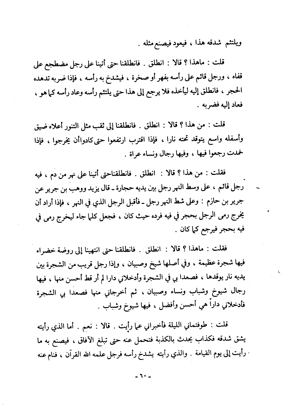 قلت: طَوَّفتماني الليلة فأخبراني عما رأيتُ. قالا: نعم. أما الذي رأيته يُشَقُّ شِدْقُه فكذاب يحدّث بالكذبة فتحمل عنه حتى تبلغ الآفاق، فيصنع به ما رأيت إلى يوم القيامة، والذي رأيته يشدخ رأسه فرجل علمه الله القرآن، فنام عنه