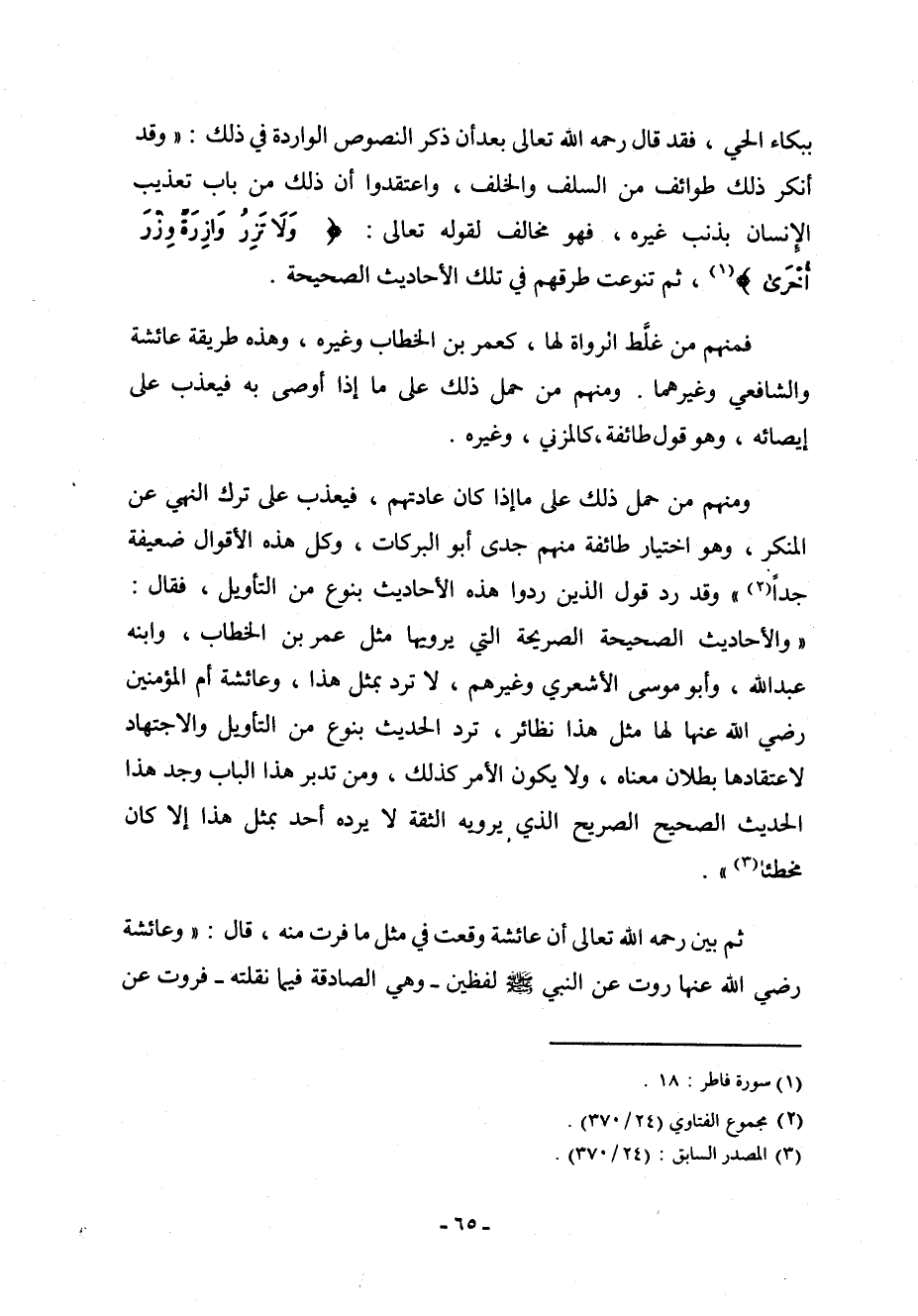 ببكاء الحي، فقد قال رحمه الله تعالى بعد أن ذكر النصوص الواردة في ذلك: " وقد أنكر ذلك طوائف من السلف والخلف، واعتقدوا أن ذلك من باب تعذيب الإنسان بذنب غيره، فهو مخالف لقوله تعالى: (وَلَا تَزِرُ وَازِرَةٌ وِزْرَ أُخْرَى) [فاطر: 18] ، ثم تنوعت طرقهم في تلك الأحاديث الصحيحة.