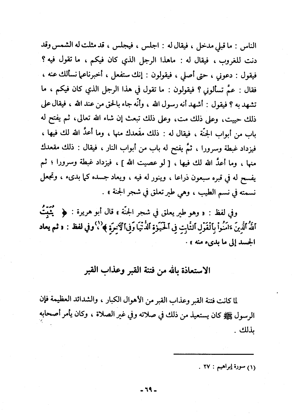 وفي لفظ: " وهو طير يعلق في شجر الجنة " قال أبو هريرة: (يُثَبِّتُ اللهُ الَّذِينَ آمَنُواْ بِالْقَوْلِ الثَّابِتِ فِي الْحَيَاةِ الدُّنْيَا وَفِي الآخِرَةِ) [إبراهيم: 27] ، وفي لفظ: " ثم يعاد الجسد إلى ما بدى منه ".