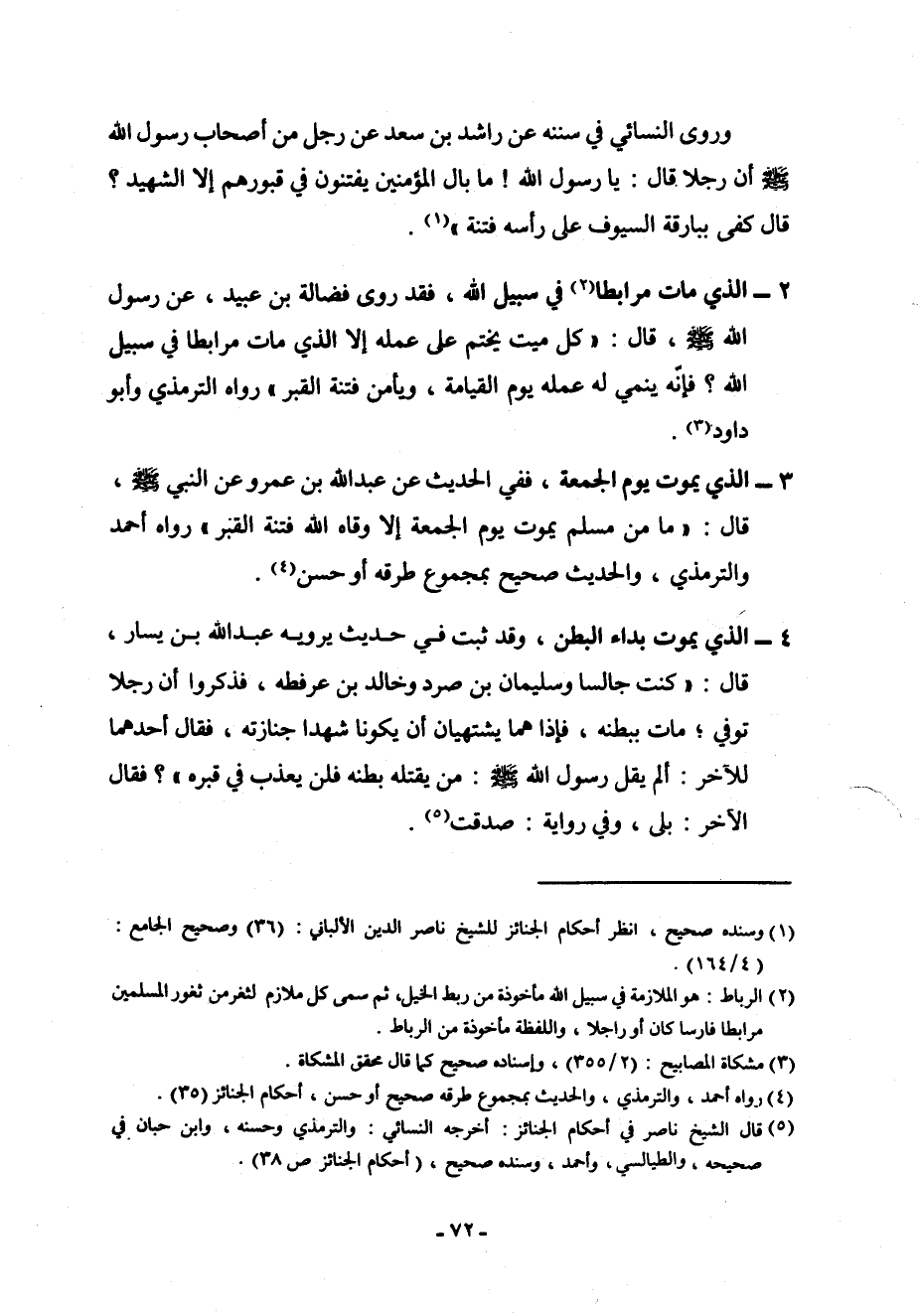 2- الذي مات مرابطاً (¬2) في سبيل الله، فقد روى فضالة بن عبيد، عن رسول الله صلى الله عليه وسلم، قال: " كل ميت يختم على عمله إلا الذي مات مرابطاً في سبيل الله؟ فإنه ينمي له عمله يوم القيامة، ويأمن فتنة القبر " رواه الترمذي وأبو داود (¬3) .