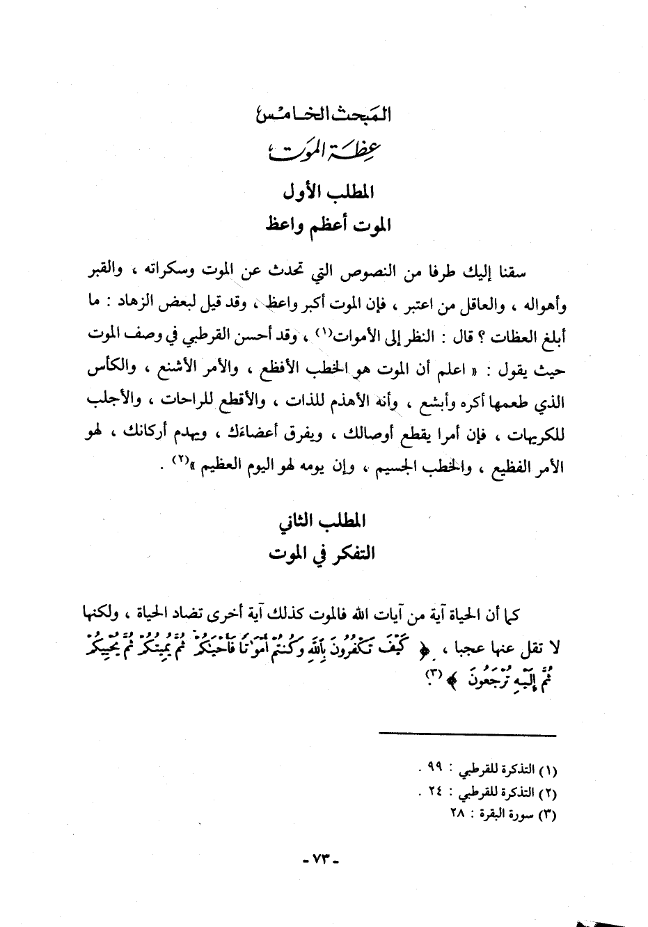 سقنا إليك طرفاً من النصوص التي تحدث عن الموت وسكراته، والقبر وأهواله، والعاقل من اعتبر، فإن الموت أكبر واعظ، وقد قيل لبعض الزهاد: ما أبلغ العظات؟ قال: النظر إلى الأموات (¬1) ، وقد أحسن القرطبي في وصف الموت حيث يقول: " اعلم أن الموت هو الخطب الأفظع، والأمر الأشنع، والكأس الذي طعمهما أكره وأبشع، وأنه الأهذم للذات، والأقطع للراحات، والأجلب للكريهات، فإن أمراً يقطع أوصالك، ويفرق أعضاءك، ويهدم أركانك، لهو الأمر الفظيع، والخطب الجسيم، وإن يومه لهو اليوم العظيم " (¬2) .