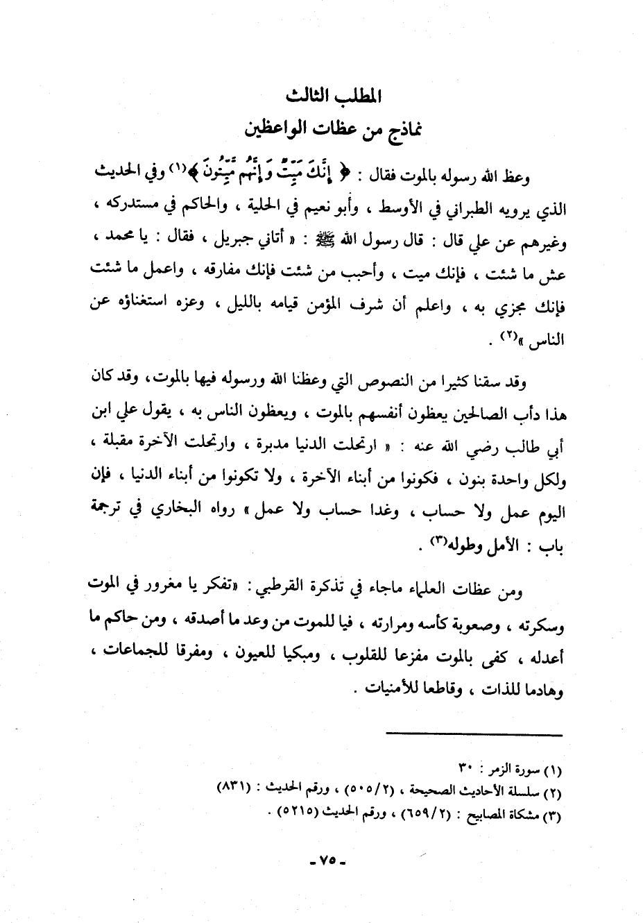 وقد سقنا كثيراً من النصوص التي وعظنا الله ورسوله فيها بالموت، وقد كان هذا دأب الصالحين يعظون أنفسهم بالموت، ويعظون الناس به، يقول علي بن أبي طالب رضي الله عنه: " ارتحلت الدنيا مدبرة، وارتحلت الآخرة مقبلة، ولكل واحدة بنون، فكونوا من أبناء الآخرة، ولا تكونوا من أبناء الدنيا، فإن اليوم عمل ولا حساب، وغداً حساب ولا عمل " رواه البخاري في ترجمة باب: الأمل وطوله (¬2) .