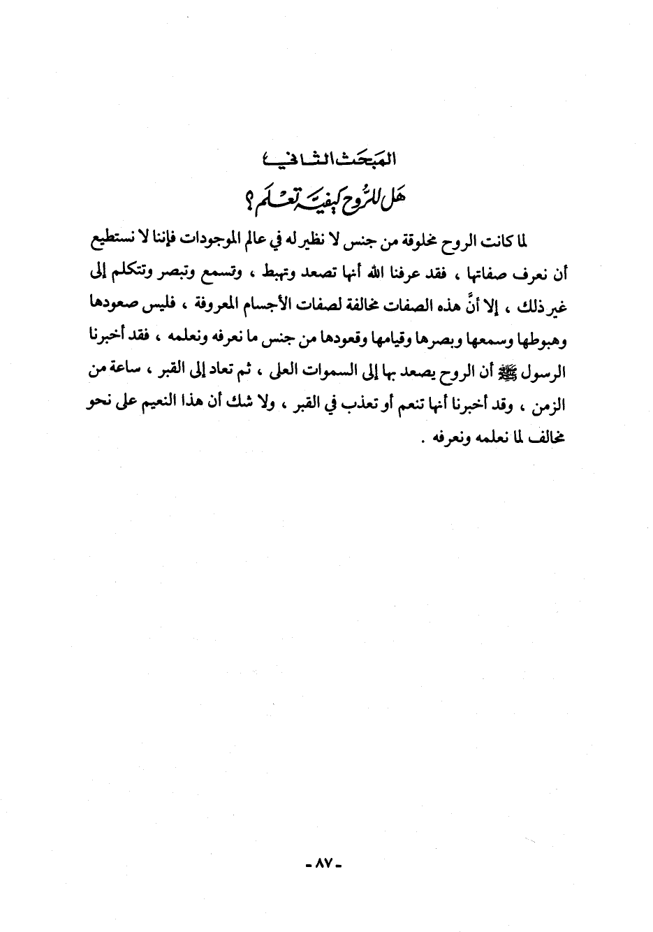 لما كنت الروح مخلوقة من جنس لا نظير له في عالم الموجودات فإننا لا نستطيع أن نعرف صفاتها، فقد عرفنا الله أنها تصعد وتهبط، وتسمع وتبصر وتتكلم إلى غير ذلك، إلا أن هذه الصفات مخالفة لصفات الأجسام المعروفة، فليس صعودها وهبوطها وسمعها وبصرها وقيامها وقعودها من جنس ما نعرفه ونعلمه، فقد أخبرنا الرسول صلى الله عليه وسلم أن الروح يصعد بها إلى السماوات العلى، ثم تعاد إلى القبر، ساعة من الزمن، وقد أخبرنا أنها تنعم أو تعذّب في القبر، ولا شك أن هذا النعيم على نحو مخالف لما نعلمه ونعرفه.