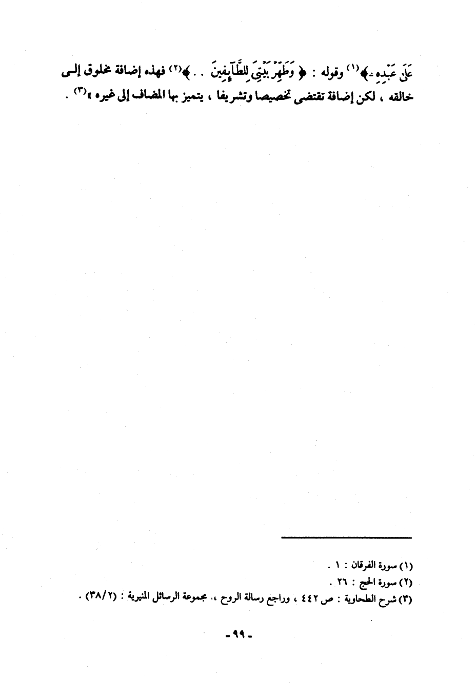 عَلَى عَبْدِهِ) [الفرقان: 1] وقوله: (وَطَهِّرْ بَيْتِيَ لِلطَّائِفِينَ ... ) [الحج: 26] فهذه إضافة مخلوق إلى خالقه، لكن إضافة تقتضي تخصيصاً وتشريفاً، يتميز بها المضاف إلى غيره " (¬1) .