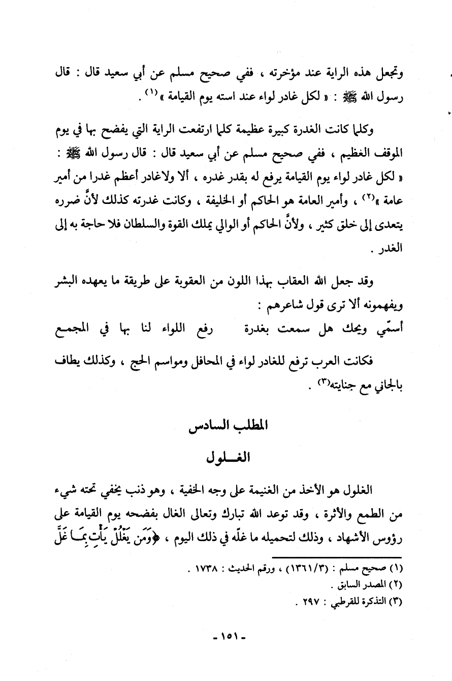 وكلما كانت الغدرة كبيرة عظيمة كلما ارتفعت الراية التي يفضح بها في يوم الموقف العظيم، ففي صحيح مسلم عن أبي سعيد قال: قال رسول الله صلى الله عليه وسلم: " لكل غادر لواء يوم القيامة يرفع له بقدر غدره، ألا ولا غادر أعظم غدراً من أمير عامة " (¬2) ، وأمير العامة هو الحاكم أو الخليفة، وكانت غدرته كذلك لأن ضرره يتعدى إلى خلق كثير، ولأن الحاكم أو الوالي يملك القوة والسلطان فلا حاجة به إلى الغدر.