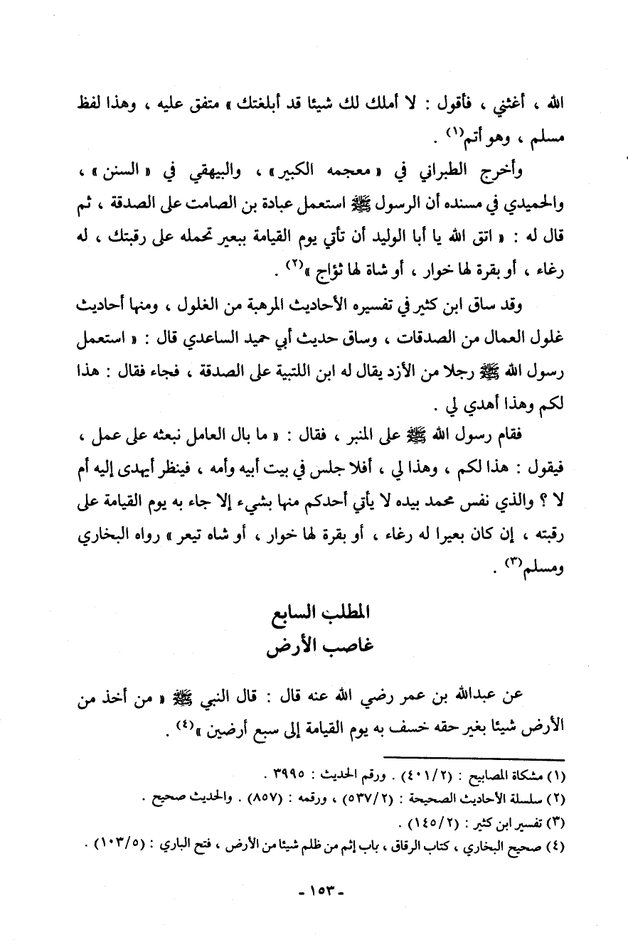 وأخرج الطبراني في ((معجمه الكبير)) ، والبيهقي في ((السنن)) والحميدي في مسنده أن الرسول صلى الله عليه وسلم استعمل عبادة بن الصامت على الصدقة، ثم قال له: " اتق الله يا أبا الوليد أن تأتي يوم القيامة ببعير تحمله على رقبتك، له رغاء، أو بقرة لها خوار، أو شاة لها ثؤاج " (¬2) .