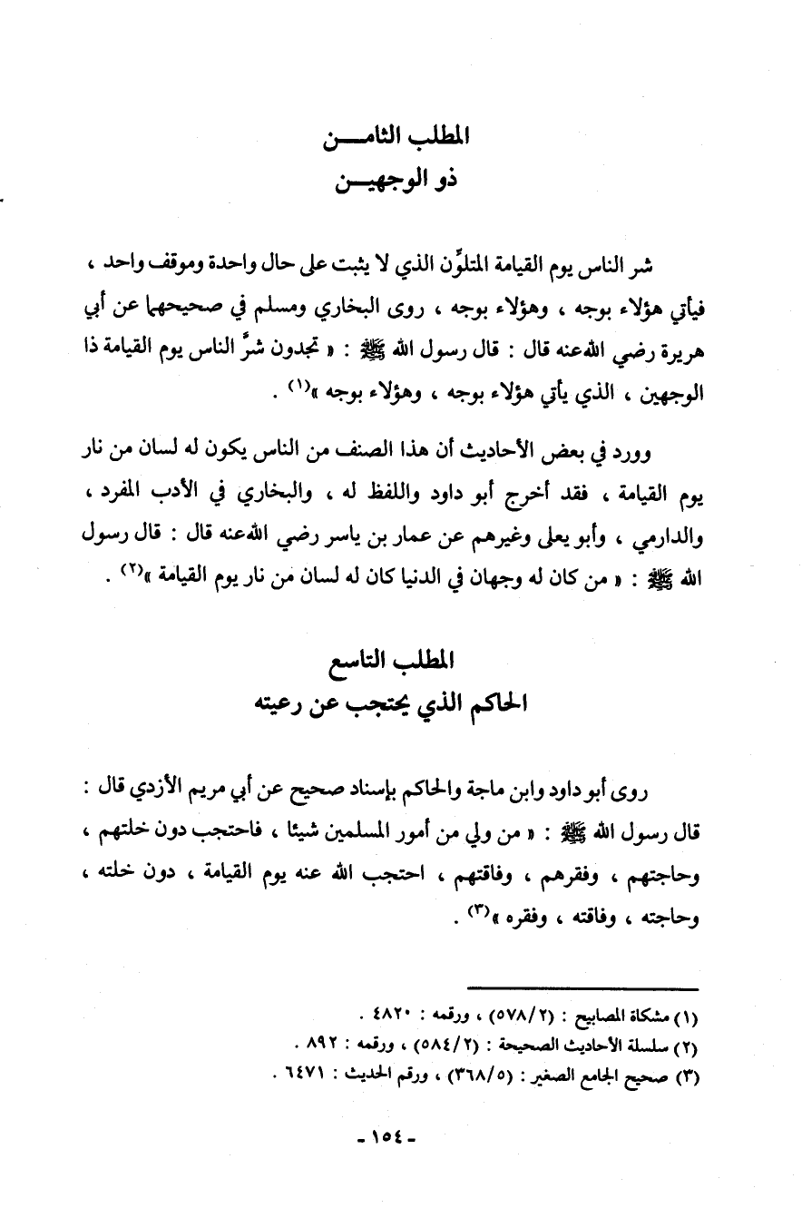 شر الناس يوم القيامة المتلون الذي لا يثبت على حال واحدة وموقف واحد، فيأتي هؤلاء بوجه، وهؤلاء بوجه، روى البخاري ومسلم في صحيحيهما عن أبي هريرة رضي الله عنه قال: قال رسول الله صلى الله عليه وسلم: " تجدون شرَّ الناس يوم القيامة ذا الوجهين، الذي يأتي هؤلاء بوجه، وهؤلاء بوجه " (¬1) .