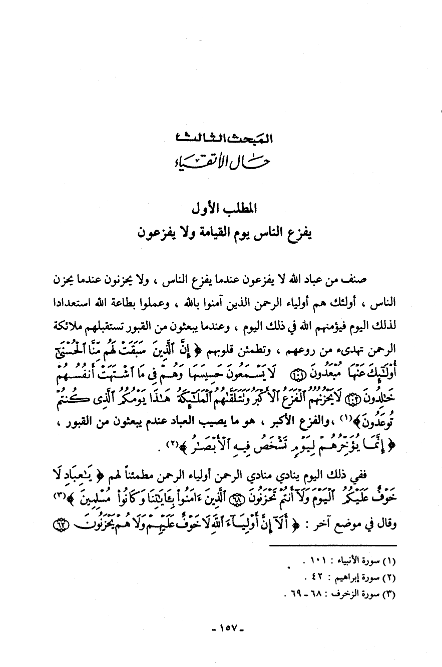 صنف من عباد الله لا يفزعون عندما يفزع الناس، ولا يحزنون عندما يحزن الناس، أولئك هم أولياء الرحمن الذين آمنوا بالله، وعملوا بطاعة الله استعداداً لذلك اليوم، فيؤمنهم الله في ذلك اليوم، وعندما يبعثون من القبور تستقبلهم ملائكة الرحمن تهدئ من روعهم، وتطمئن قلوبهم (إِنَّ الَّذِينَ سَبَقَتْ لَهُم مِّنَّا الْحُسْنَى أُوْلَئِكَ عَنْهَا مُبْعَدُونَ - لَا يَسْمَعُونَ حَسِيسَهَا وَهُمْ فِي مَا اشْتَهَتْ أَنفُسُهُمْ خَالِدُونَ - لَا يَحْزُنُهُمُ الْفَزَعُ الْأَكْبَرُ وَتَتَلَقَّاهُمُ الْمَلَائِكَةُ هَذَا يَوْمُكُمُ الَّذِي كُنتُمْ تُوعَدُونَ) [الأنبياء: 101-103] ، والفزع الأكبر، هو ما يصيب العباد عندما يبعثون من القبور، (إِنَّمَا يُؤَخِّرُهُمْ لِيَوْمٍ تَشْخَصُ فِيهِ الأَبْصَارُ) [إبراهيم: 42] .