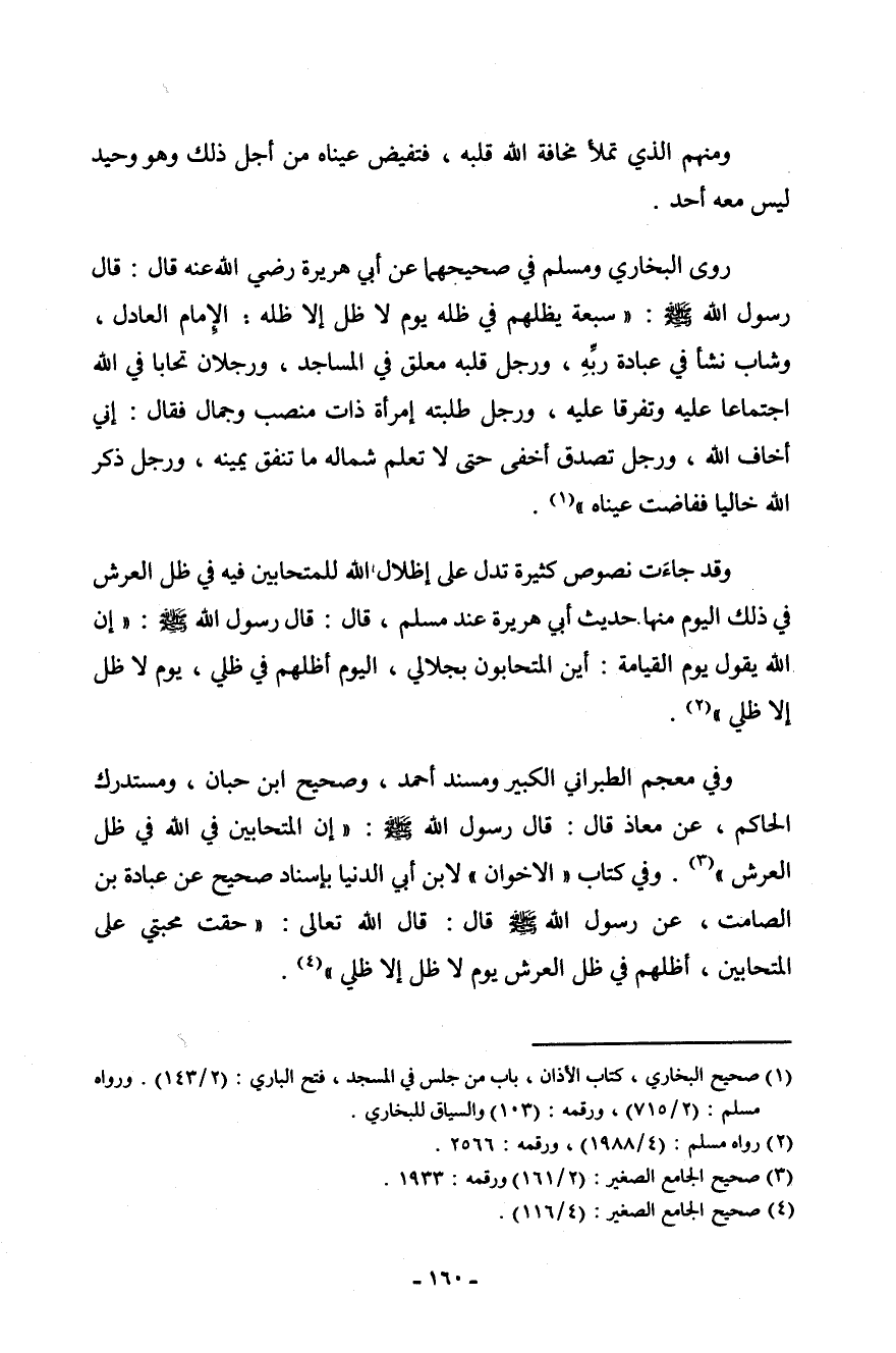 روى البخاري ومسلم في صحيحيهما عن أبي هريرة رضي الله عنه قال: قال رسول الله صلى الله عليه وسلم: " سبعة يظلهم الله في ظله يوم لا ظل إلا ظله، الإمام العادل، وشاب ينشأ في عبادة ربه، ورجل قلبه معلق في المساجد، ورجلان تحابا في الله اجتمعا عليه وتفرقا عليه، ورجل طلبته امرأة ذات منصب وجمال فقال: إني أخاف الله، ورجل تصدق أخفى حتى لا تعلم شماله ما تنفق يمينه، ورجل ذكر الله خالياً ففاضت عيناه " (¬1) .