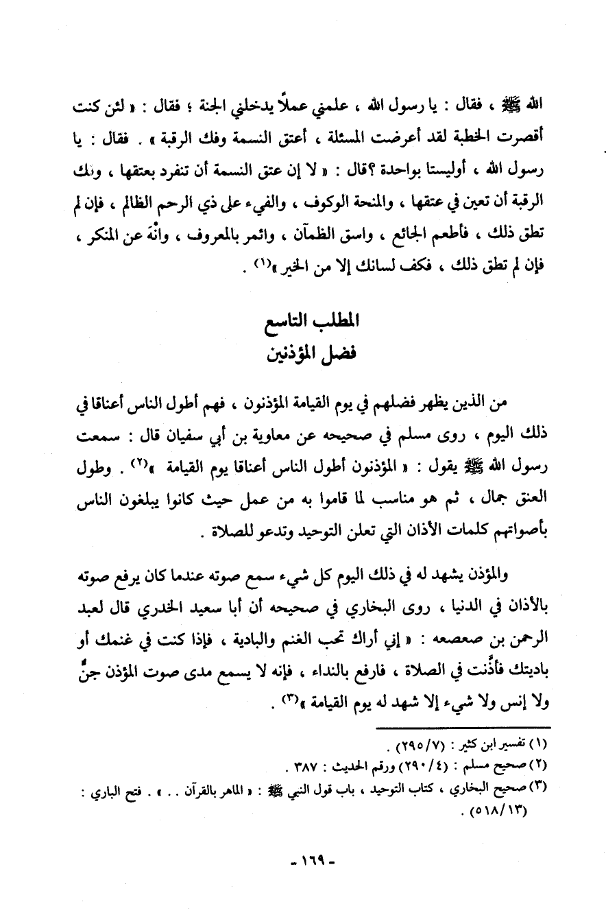 من الذين يظهر فضلهم يوم القيامة المؤذنون، فهم أطول الناس أعناقاً في ذلك اليوم، روى مسلم في صحيحه عن معاوية بن أبي سفيان قال: سمعت رسول الله صلى الله عليه وسلم يقول: " المؤذنون أطول الناس أعناقاً يوم القيامة " (¬2) . وطول العنق جمال، ثم هو مناسب لما قاموا به من عمل حيث كانوا يبلغون الناس بأصواتهم كلمات الأذان التي تعلن التوحيد وتدعو للصلاة.