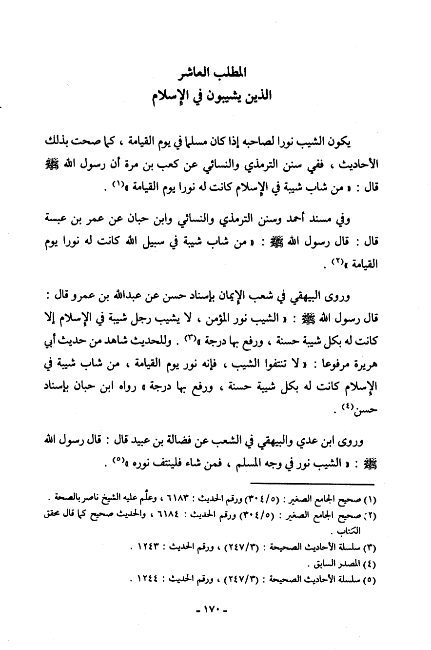 وفي مسند أحمد وسنن الترمذي والنسائي وابن حبان عن عمرو بن عبسة قال: قال رسول الله صلى الله عليه وسلم: " من شاب شيبة في سبيل الله كانت له نوراً يوم القيامة " (¬2) .