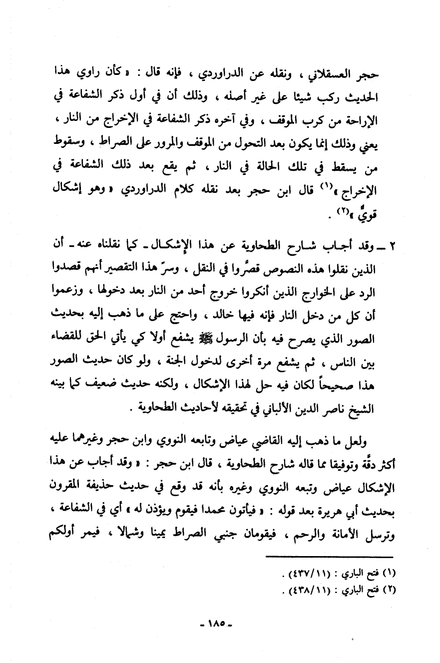 حجر العسقلاني، ونقله عن الدراوردي، فإنه قال: " كأن راوي هذا الحديث ركب شيئاً على غير أصله، وذلك أن في أول ذكر الشفاعة في الإراحة من كرب الموقف، وفي آخره ذكر الشفاعة في الإخراج من النار، يعني وذلك إنما يكون بعد التحول من الموقف والمرور على الصراط، وسقوط من يسقط في تلك الحالة في النار، ثم يقع بعد ذلك الشفاعة في الإخراج " (¬1) قال ابن حجر بعد نقله كلام الدراوردي " وهو إشكال قويٌّ " (¬2) .