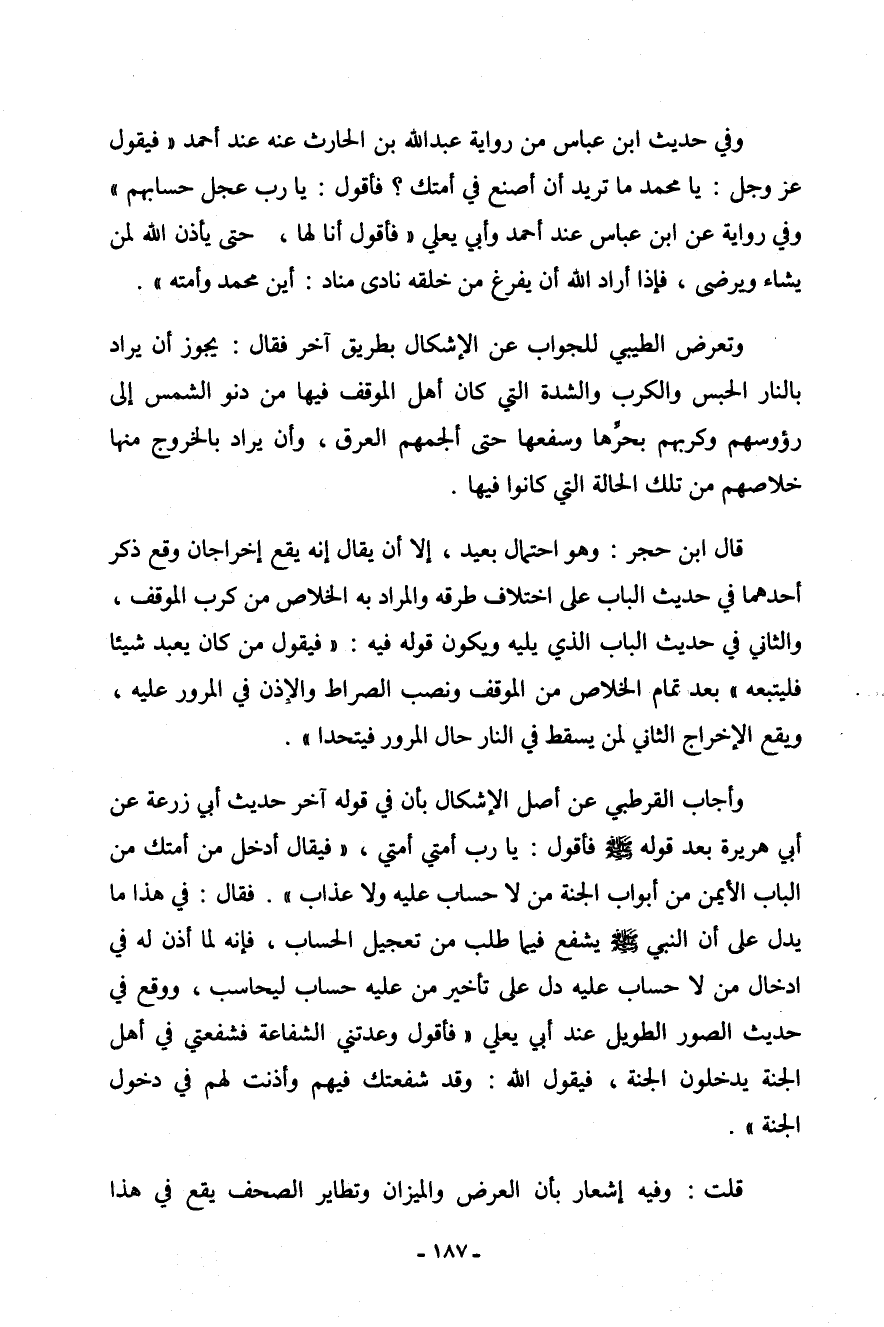 وتعرَّض الطيبي للجواب عن الإشكال بطريق آخر فقال: يجوز أن يراد بالنار الحبس والكرب والشدة التي كان أهل الموقف فيها من دنو الشمس إلى رؤوسهم وكربهم بحرها وسفعها حتى ألجمهم العرق، وأن يراد بالخروج منها خلاصهم من تلك الحالة التي كانوا فيها.