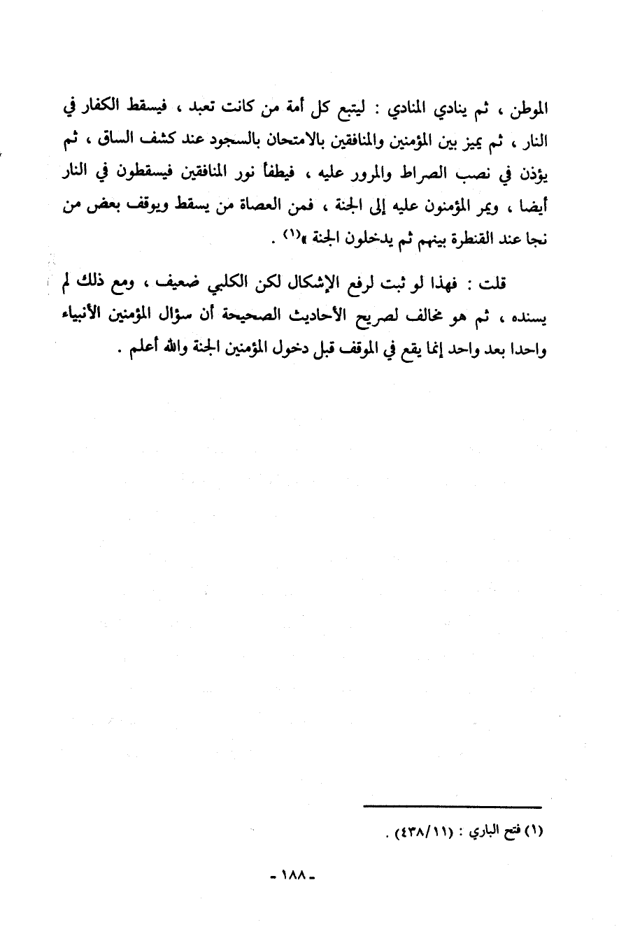 الموطن، ثم ينادي المنادي: ليتبع كل أمة من كانت تعبد، فيسقط الكفار في النار، ثم يميز بين المؤمنين والمنافقين بالامتحان بالسجود عند كشف الساق، ثم يؤذن في نصب الصراط والمرور عليه، فيطفأ نور المنافقين فيسقطون في النار أيضاً، ويمر المؤمنون عليه إلى الجنة، فمن العصاة من يسقط ويوقف بعض من نجا عند القنطرة بينهم ثم يدخلون الجنة " (¬1) .