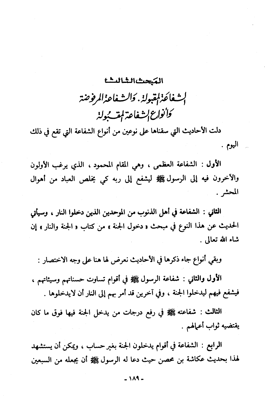 الثاني: الشفاعة في أهل الذنوب من الموحدين الذين دخلوا النار، وسيأتي الحديث عن هذا النوع في مبحث ((دخول الجنة)) من كتاب ((الجنة والنار)) إن شاء الله تعالى [وهي مذكوره في موقع الجنة والنار] .