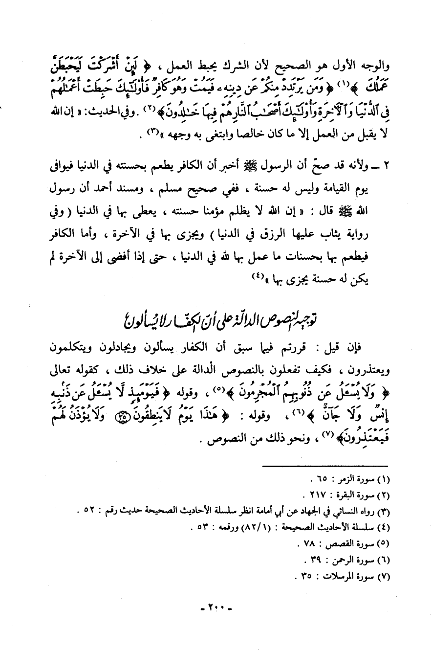 فإن قيل: قررتم فيما سبق أن الكفار يسألون ويجادلون ويتكلمون ويعتذرون، فيكف تفعلون بالنصوص الدالة على خلاف ذلك، كقوله تعالى: (وَلَا يُسْأَلُ عَن ذُنُوبِهِمُ الْمُجْرِمُونَ) [القصص: 78] ، وقوله: (فَيَوْمَئِذٍ لَّا يُسْأَلُ عَن ذَنبِهِ إِنسٌ وَلَا جَانٌّ) [الرحمن: 39] ، وقوله: (هَذَا يَوْمُ لَا يَنطِقُونَ - وَلَا يُؤْذَنُ لَهُمْ فَيَعْتَذِرُونَ) [المرسلات: 35-36] ، ونحو ذلك من النصوص.