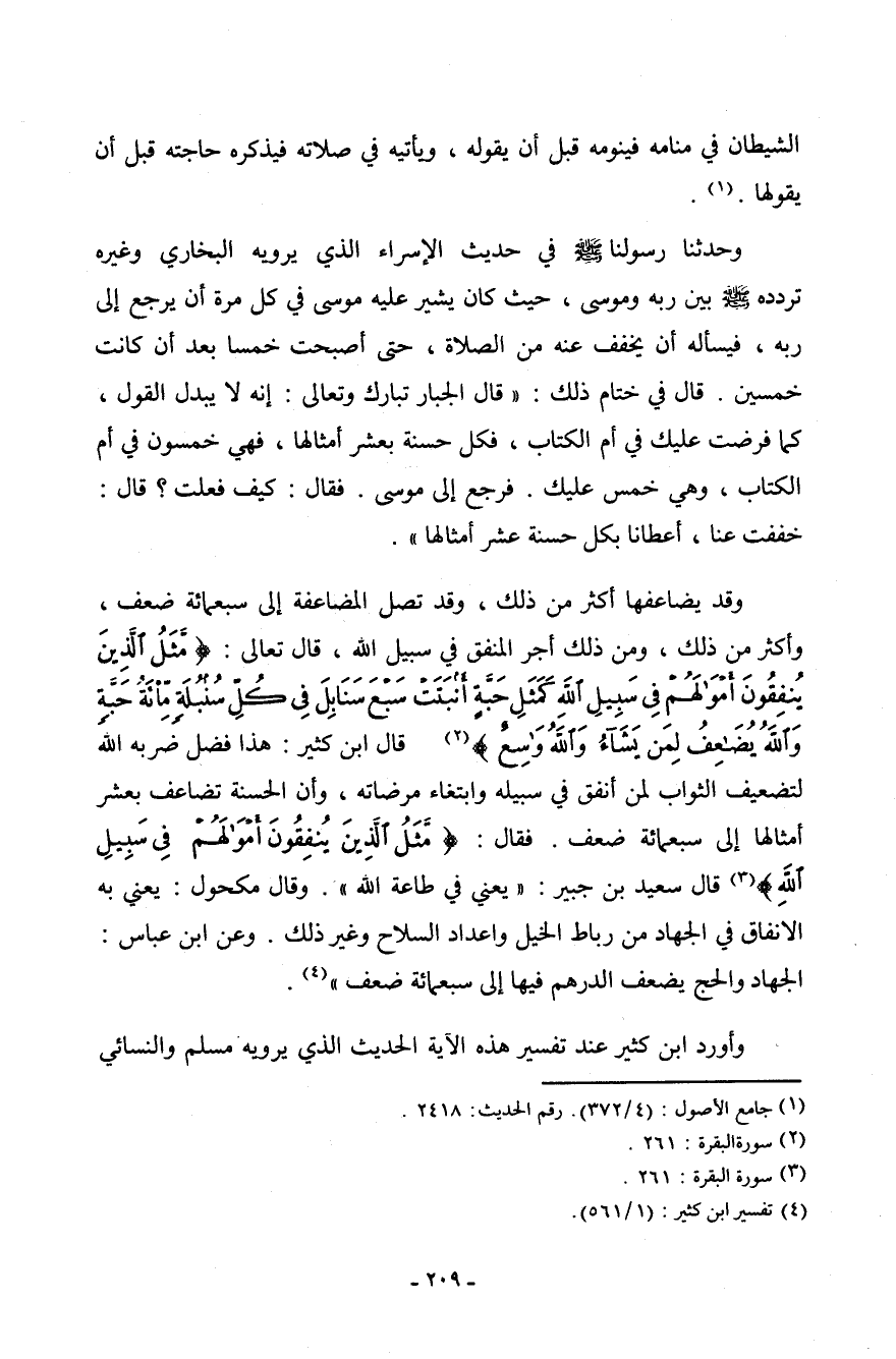 وحدثنا رسولنا صلى الله عليه وسلم في حديث الإسراء الذي يرويه البخاري وغيره تردده صلى الله عليه وسلم بين ربه وموسى، حيث كان يشير عليه موسى في كل مرة أن يرجع إلى ربه، فيسأله أن يخفف عنه من الصلاة، حتى أصبحت خمساً بعد أن كانت خمسين.. قال في ختام ذلك: " قال الجبار تبارك وتعالى: إنه لا يبدل القول، كما فرضت عليك في أم الكتاب، فكل حسنة بعشرة أمثالها، فهي خمسون في أم الكتاب، وهي خمس عليك، فرجع إلى موسى. فقال: كيف فعلت؟ قال: خففت عنا، أعطانا بكل حسنة عشرة أمثالها ".