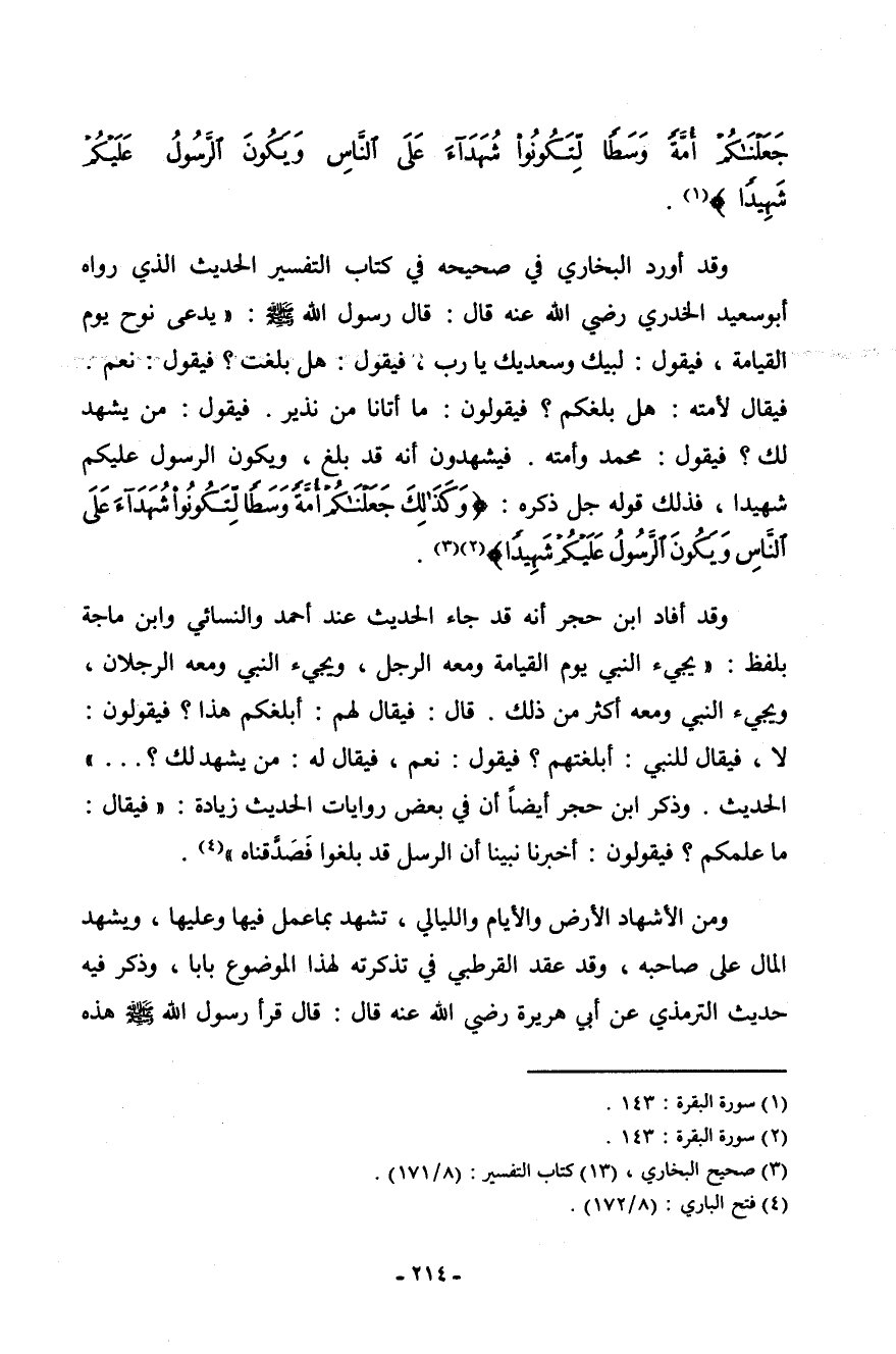 جَعَلْنَاكُمْ أُمَّةً وَسَطًا لِّتَكُونُواْ شُهَدَاء عَلَى النَّاسِ وَيَكُونَ الرَّسُولُ عَلَيْكُمْ شَهِيدًا) [البقرة: 143] .