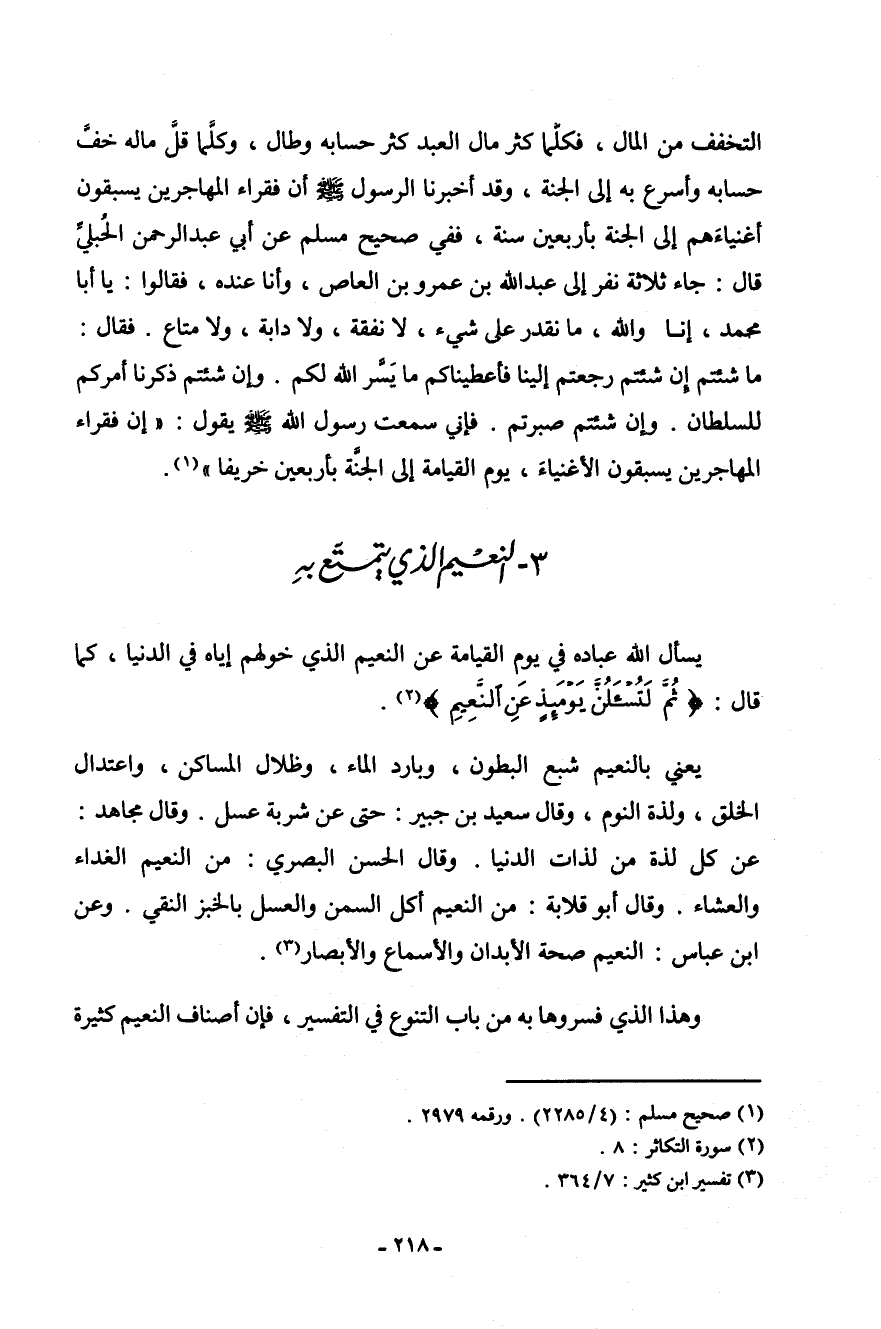 التخفف من المال، فكلما كثر مال العبد كثر حسابه وطال، وكلما قل ماله خف حسابه وأسرع به إلى الجنة، وقد أخبرنا الرسول صلى الله عليه وسلم أن فقراء المهاجرين يسبقون أغنياءهم إلى الجنة بأربعين سنة، ففي صحيح مسلم عن أبي عبد الرحمن الحبلي قال: جاء ثلاثة نفر إلى عبد الله بن عمرو بن العاص، وأنا عنده، فقالوا: يا أبا محمد، إنا والله، ما نقدر على شيء، لا نفقة، ولا دابة، ولا متاع. فقال: ما شئتم إن شئتم رجعتم إلينا فأعطيناكم ما يسر الله لكم. وإن شئتم ذكرنا أمركم للسلطان. وإن شئتم صبرتم. فإني سمعت رسول الله صلى الله عليه وسلم يقول: " إن فقراء المهاجرين يسبقون الأغنياء، يوم القيامة إلى الجنة بأربعين خريفاً " (¬1) .