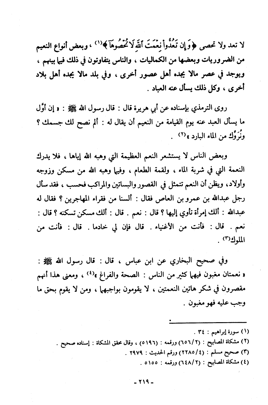 لا تعد ولا تحصى (وإن تعدوا نعمة الله لا تحصوها) [إبراهيم: 34] ، وبعض أنواع النعيم من الضروريات وبعضها من الكماليات، والناس يتفاوتون في ذلك فيما بينهم، ويوجد في عصر مالا يجده أهل عصور أخرى، وفي بلد ما لا يجده أهل بلاد أخرى، وكل ذلك يسأل عنه العباد.