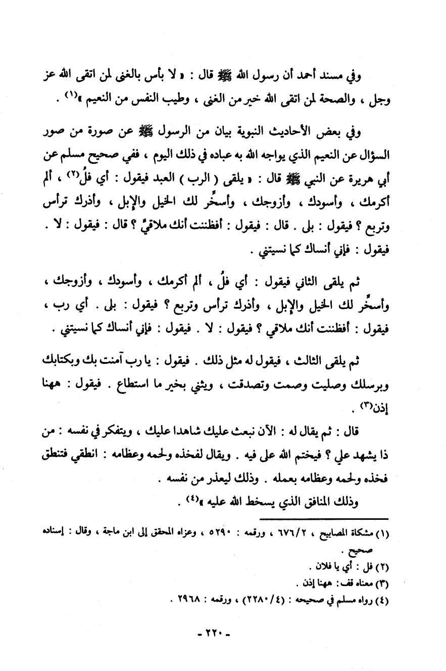 وفي بعض الأحاديث النبوية بيان من الرسول صلى الله عليه وسلم عن صورة من صور السؤال عن النعيم الذي يواجه الله به عباده في ذلك اليوم، ففي صحيح مسلم عن أبي هريرة عن النبي صلى الله عليه وسلم قال: " يلقى (الرب) العبد فيقول: أي فُل (¬2) ، ألم أكرمك، وأسودك، وأزوجك، وأسخر لك الخيل والإبل، وأذرك ترأس وتربع؟ فيقول: بلى. قال: فيقول: أفظننت أنك ملاقي؟ قال: فيقول: لا. فيقول: فإني أنساك كما نسيتني.