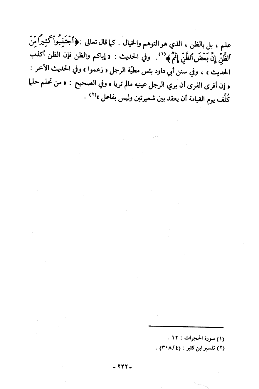 علم، بل بالظن، الذي هو التوهم والخيال. كما قال تعالى: (اجْتَنِبُوا كَثِيرًا مِّنَ الظَّنِّ إِنَّ بَعْضَ الظَّنِّ إِثْمٌ) [الحجرات: 12] . وفي الحديث: " إياكم والظن فإن الظن أكذب الحديث "، وفي سنن أبي داود بئس مطية الرجل: (زعموا) وفي الحديث الآخر: " إن أفرى الفرى أن يري الرجل عينيه ما لم تريا " وفي الصحيح: " من تحلم حلماً كلف يوم القيامة أن يعقد بين شعيرتين وليس بفاعل " (¬1) .