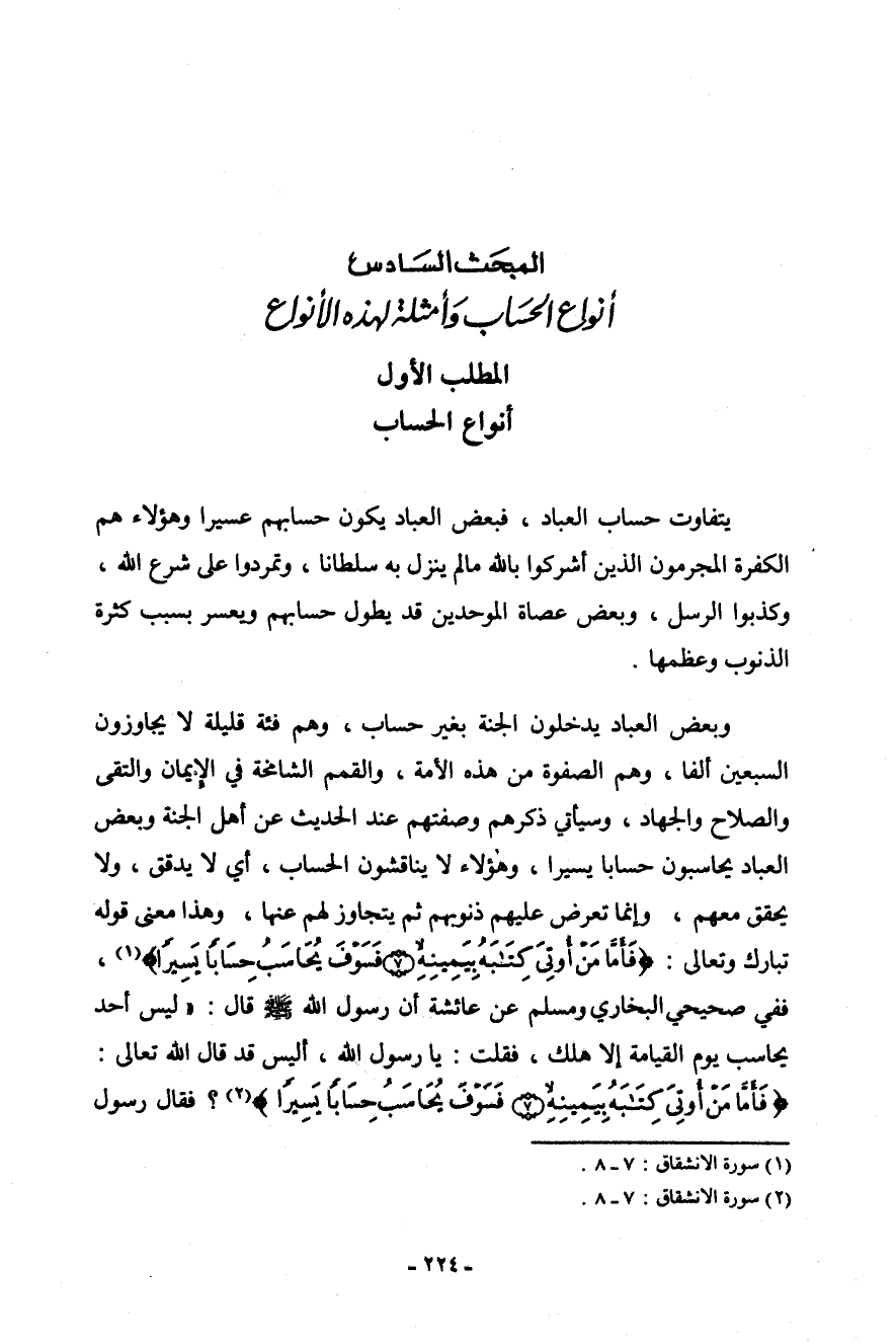 وبعض العباد يدخلون الجنة بغير حساب، وهم فئة قليلة لا يجاوزون السبعين ألفاً، وهم الصفوة من هذه الأمة، والقمم الشامخة في الإيمان والتقى والصلاح والجهاد، وسيأتي ذكرهم وصفتهم عند الحديث عن أهل الجنة وبعض العباد يحاسبون حساباً يسيراً، وهؤلاء لا يناقشون الحساب، أي لا يدقق، ولا يحقق معهم، وإنما تعرض عليهم ذنوبهم ثم يتجاوز لهم عنها.