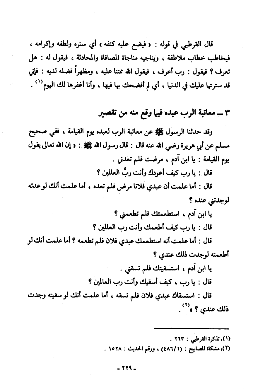 وقد حدثنا الرسول صلى الله عليه وسلم عن معاتبة الرب لعبده يوم القيامة، ففي صحيح مسلم عن أبي هريرة رضي الله عنه قال: قال رسول الله صلى الله عليه وسلم: " إن الله تعالى يقول يوم القيامة: يا ابن آدم، مرضت فلم تعدني.