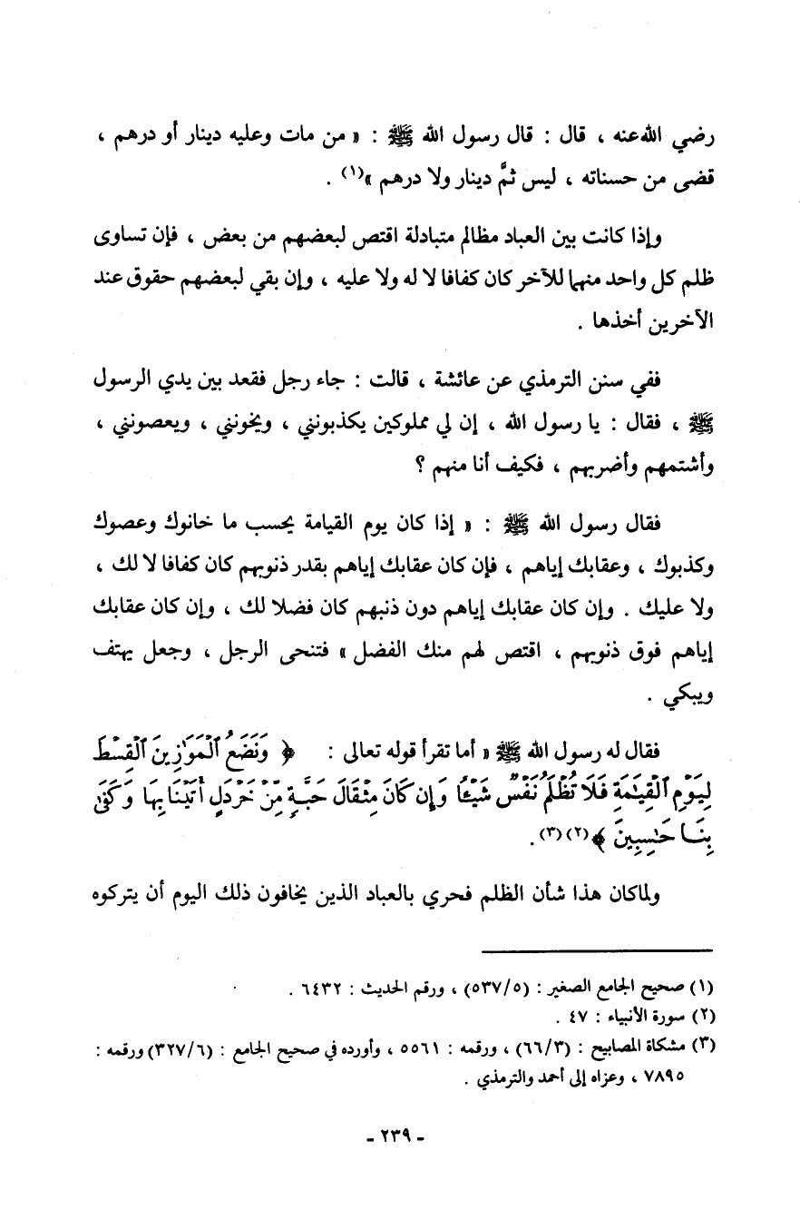 فقال له رسول الله صلى الله عليه وسلم: " أما تقرأ قوله تعالى: (وَنَضَعُ الْمَوَازِينَ الْقِسْطَ لِيَوْمِ الْقِيَامَةِ فَلَا تُظْلَمُ نَفْسٌ شَيْئًا وَإِن كَانَ مِثْقَالَ حَبَّةٍ مِّنْ خَرْدَلٍ أَتَيْنَا بِهَا وَكَفَى بِنَا حَاسِبِينَ) [الأنبياء: 47] " (¬2) .